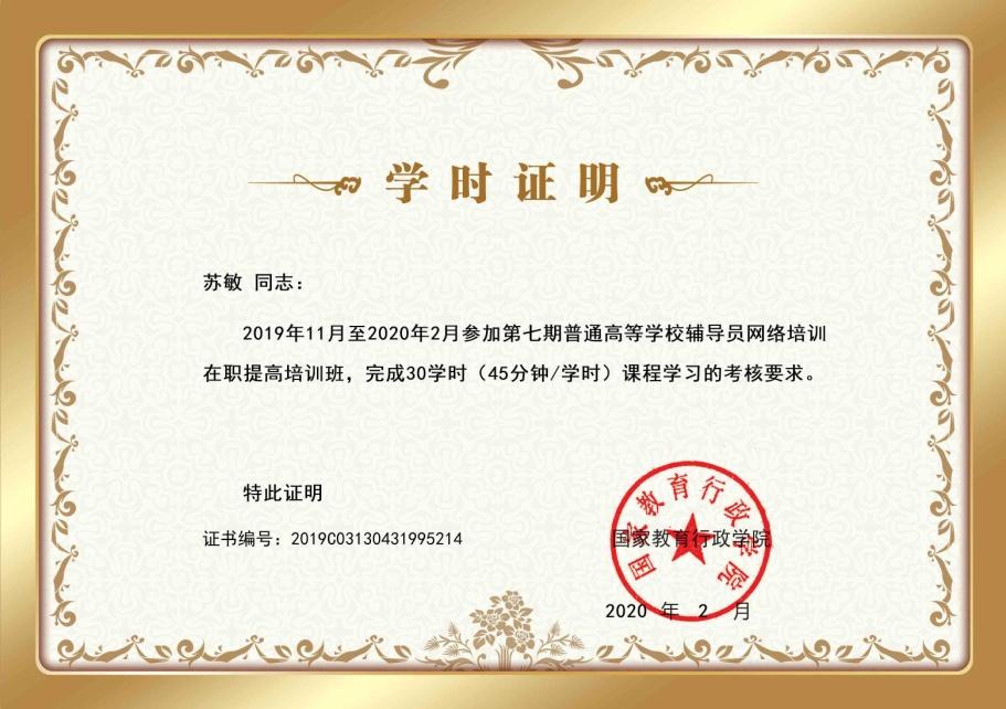 学校首届辅导员年度人物苏敏老师率先完成学习任务拿到学时证明