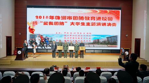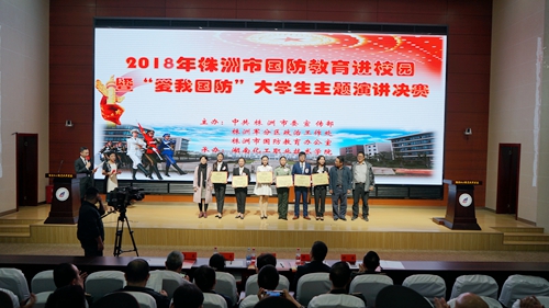 10月23日下午,2018年株洲市“爱我国防”大学生主题演讲决赛在我校举办,湖南省军区政治工作局副主任、省国教办主任谭柏林,株洲市委常委、宣传部长聂方红,株洲军分区政治委员周杰,株洲市荷塘区人武部部长马永章和我校党委书记刘望等领导出席活动,全程观看并为获奖单位和选手颁奖。