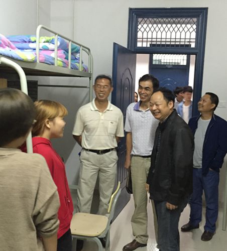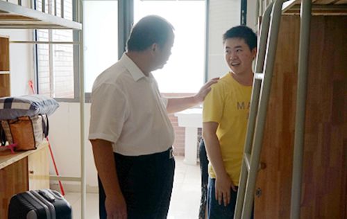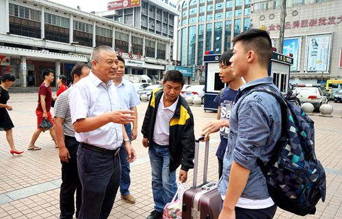 王雄伟校长和王为副校长等在火车站与新生交谈