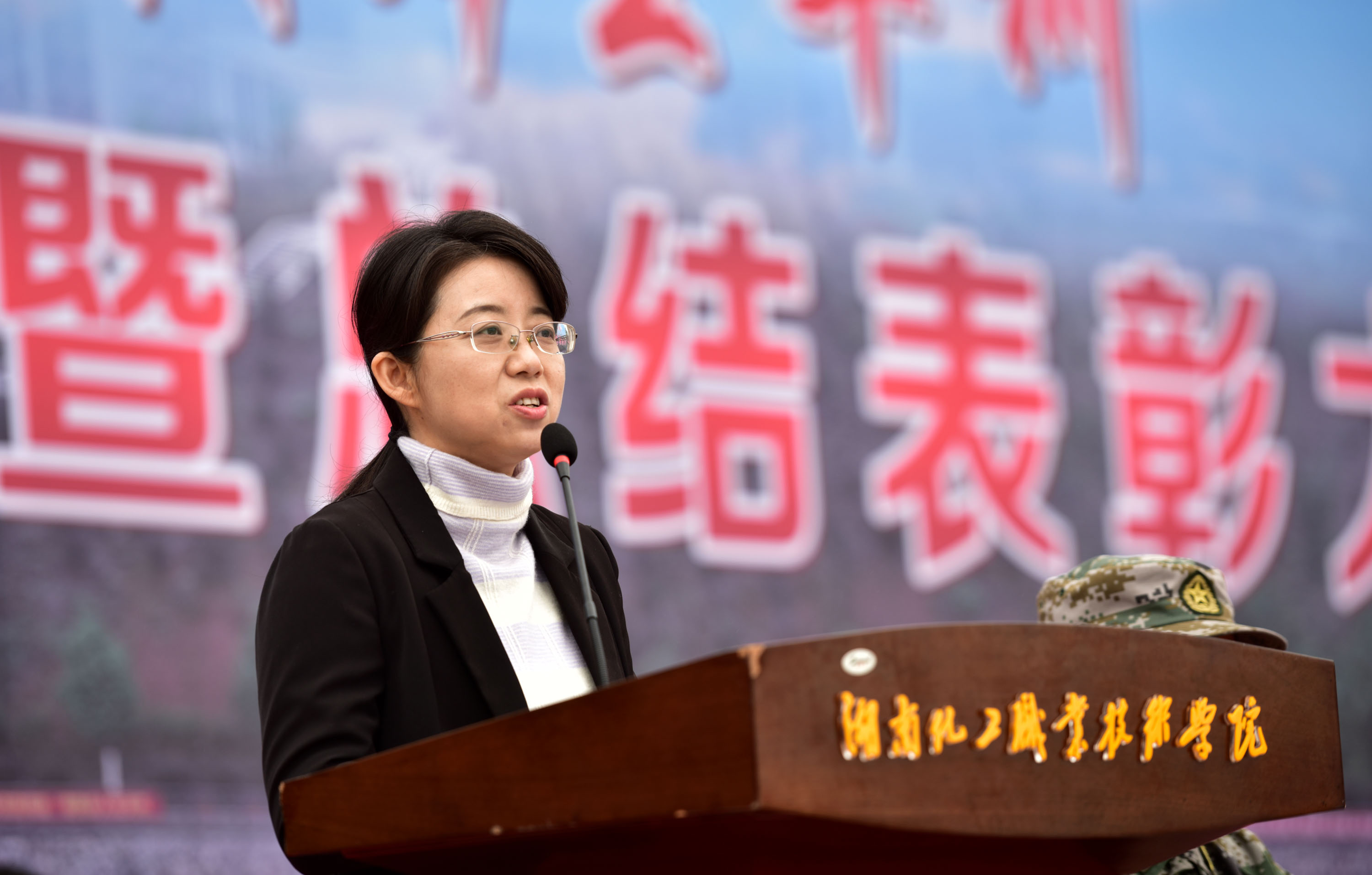 学校副校长胡颖蔓作军训总结报告,她总结了本次军训的5个特点:一是部署安排周密;二是组织严谨有序;三是训练认真刻苦;四是内容丰富多彩;五是军训成果凸显。本次军训,2020级近5600名新生,分布在5个二级学院共有141个行政班级中,本次军训编成5个营110个连队。学校高度重视,专题审议军事训练安排和《军事训练安全应急预案》,学校武装部全程跟进。因疫情影响,场地限制因素,新生军事技能训练采取分时错峰,与内务整理交叉进行,14天的军训安排周密,稳步推进。军训期间,学校领导、学工处、各二级学院和相关部门负责人到现场巡查,辅导员、班主任以及教官们、代班学长更是与同学们一起在训练中度过难忘的两周时光。她希望新同学们尽快适应大学生活,不断的锤炼自我、塑造自我、展示自我,成为学校和家人的骄傲。