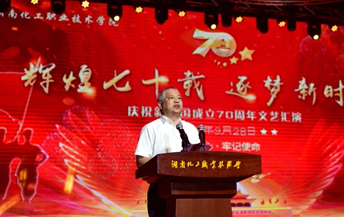 王雄伟代表学校党委、行政向老师和同学们致以节日的问候。他在致辞中指出,学校深入学习贯彻习近平新时代中国特色社会主义思想和贯彻落实立德树人根本任务,事业发展取得了巨大成绩。湖南化工职院是首批全国党建工作示范高校培育创建单位(全国10所,其中全国高职高专唯一)、国家优质专科高等职业院校、湖南省优秀示范性(骨干)高职院校、湖南省卓越高等职业技术学院建设单位等等一系列成绩。他强调,今后几年是学校加快发展的关键时期,广大教职工要始终坚持以习近平新时代中国特色社会主义思想为指导,不断加强学校党的建设,持续推进学校健康高质量发展。立足本职,勇于担当,开拓进取,真正肩负起教书育人、管理育人、服务育人的历史使命;青年学生要按照党和国家的要求,胸怀祖国,奋发成才,心系社会,服务人民,在实现中华民族伟大复兴的征程上书写自己无悔的人生。最后,共同祝愿我们伟大祖国更加繁荣昌盛,祝老师们幸福安康,祝同学们前程似锦,预祝文艺演出圆满成功。
