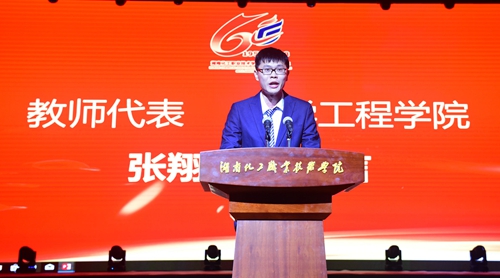 化学工程学院张翔博士作为教师代表发言,他饱含深情地与大家一同分享了湖南化工职业技术学院的发展与壮大。他说,回首往昔六十载的奋斗史,我们无比骄傲;畅想未来,我们心驰神往;往事如歌,未来如诗,在新时代、新目标、新征程中,长歌豪迈待我们挥斥方遒,伟大梦想需我们砥砺担当。