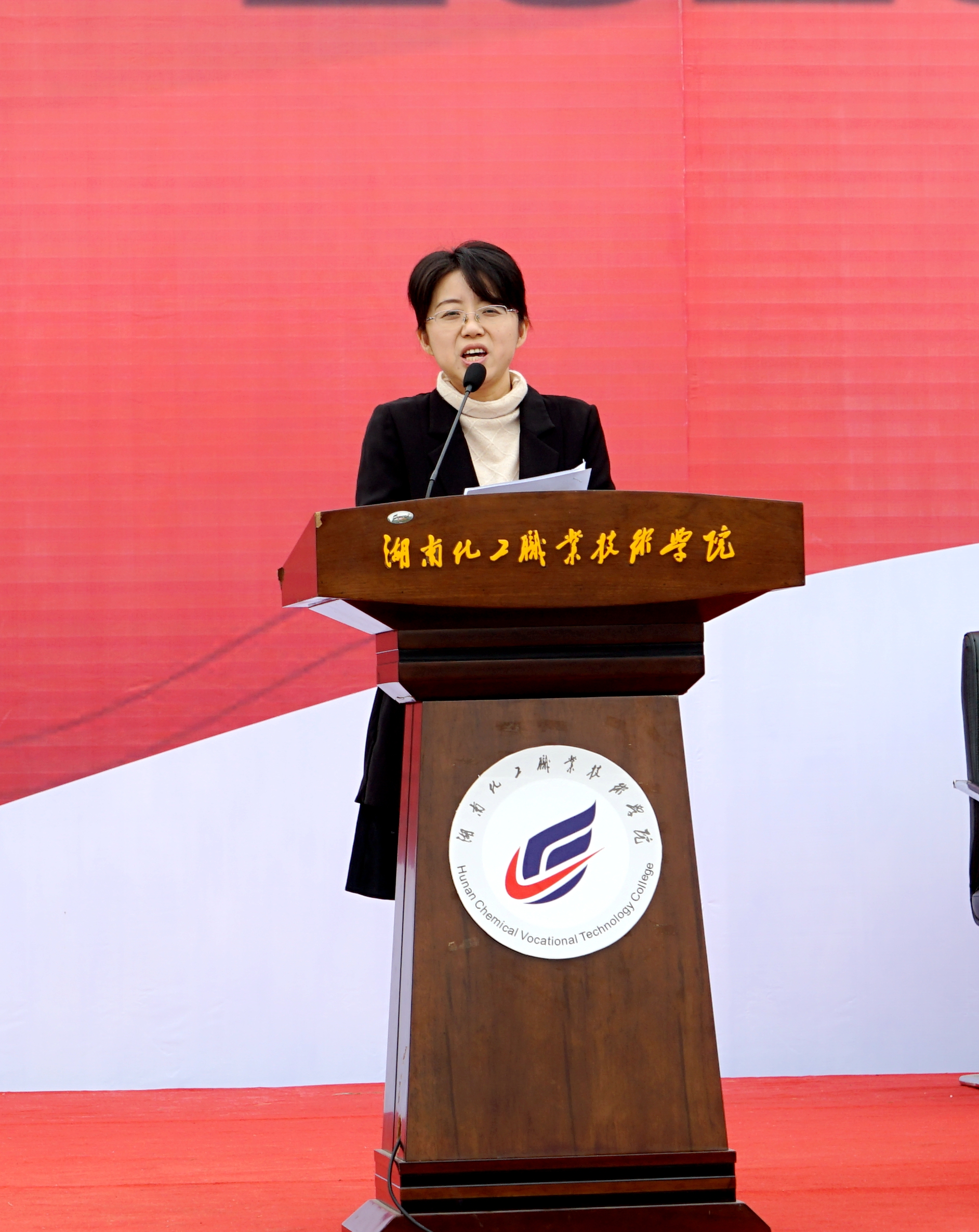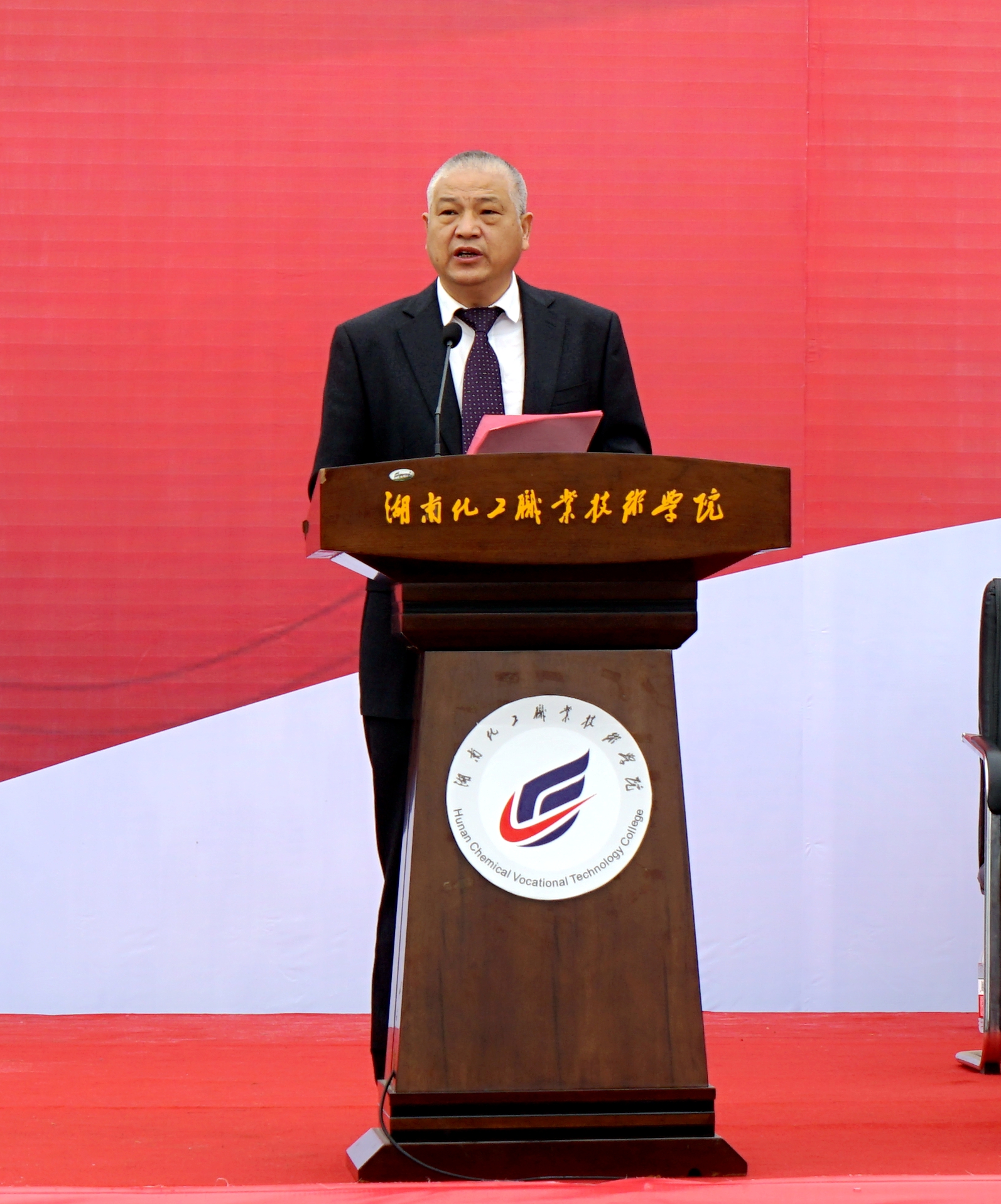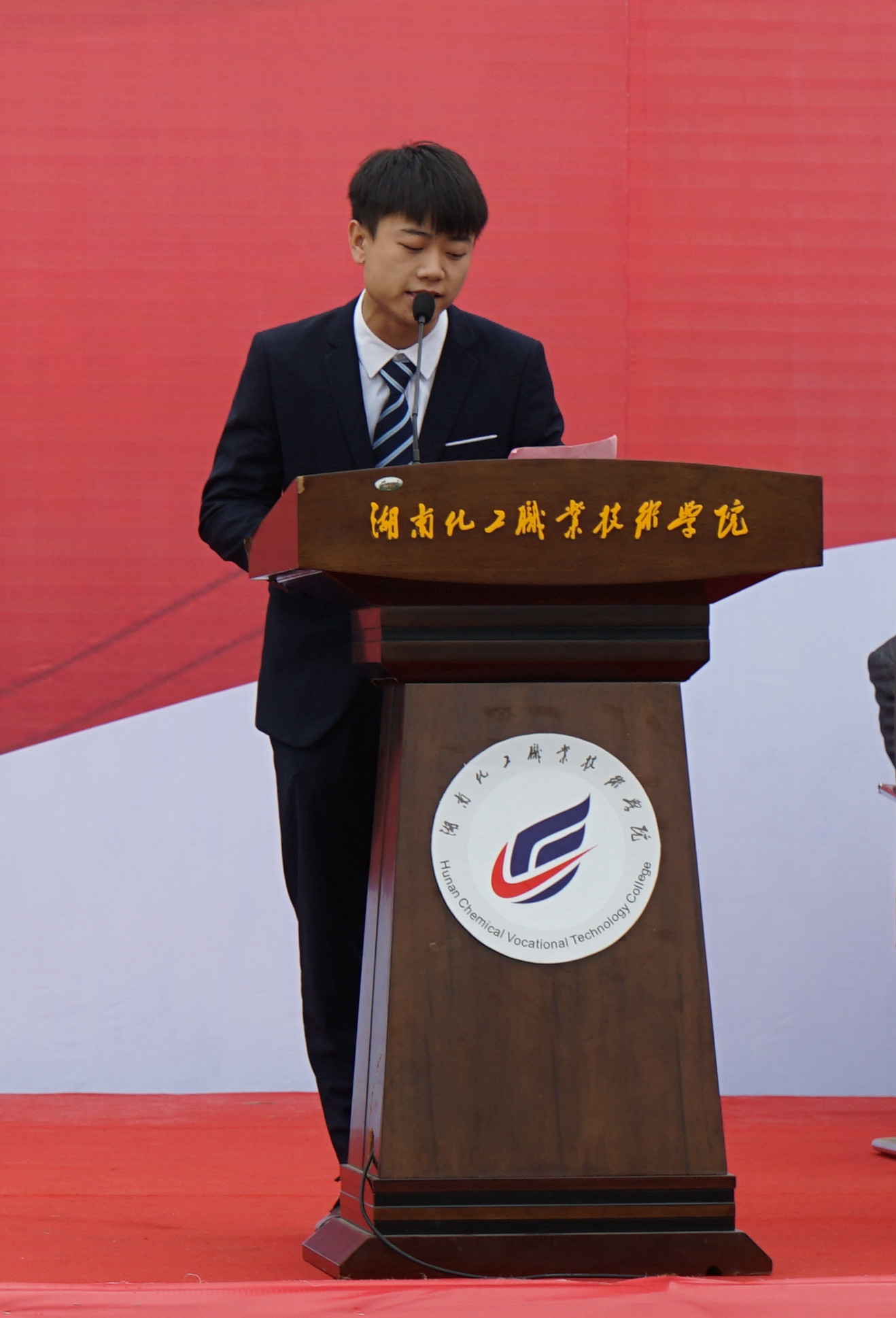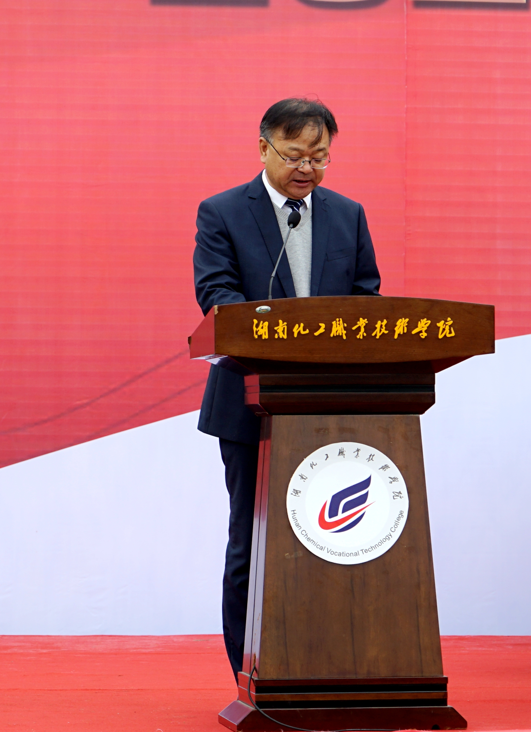 在热烈的掌声中,校长陈超首先致辞。他对入学的新生表示诚挚欢迎与祝贺。他向广大新生简要介绍了学校发展基本情况。他说,湖南化工职业技术学院是国家优质专科高等职业院校、首批全国党建工作示范高校培育创建单位、湖南省卓越高等职业技术学院建设单位,是湖南省首批就业创业优秀示范校,连续5次获得湖南省就业创业“一把手工程”优秀单位。他强调,我校自办学以来,始终传承和弘扬“厚德、励志、笃学、精艺”的校训精神,形成了“和谐、奋发、唯实、创新”的校风,坚守办学初心,笃定大学使命。他希望同学们把自身发展与国家前途、民族命运紧密联系在一起,并提出三点殷切期望:一要热爱祖国,树立远大理想,做一个有灵魂的人;二要努力学习,锤炼过硬技能,做一个有本领的人;三要积极向上,培养健康身心,做一个有品质的人。最后,他希望同学们不负时代重托,不负青春韶华,以饱满的热情去迎接新的挑战,为理想、为成功去拼搏、去奋斗,为实现“两个一百年”奋斗目标和中华民族伟大复兴的中国梦贡献力量!