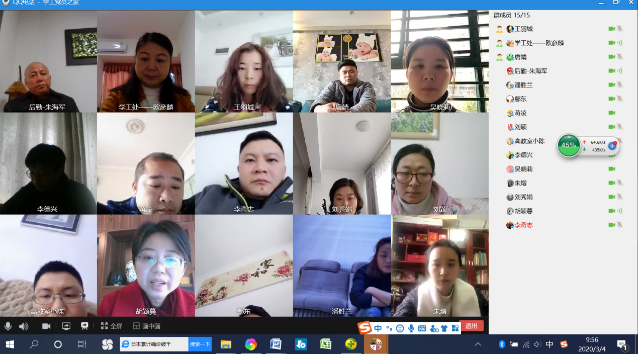 3月4日上午9点,学工与团委直属党支部召开全体党员视频会议。分管校领导胡颖蔓副校长以“不忘初心,牢记使命,众志成城,抗击疫情”为题,结合当前疫情防控工作给学工与团委直属党支部全体党员上了一趟生动精彩的党课。网络支部党员大会上,学工与团委直属党支部书记、学工部(处)朱海军处长按照党委宣传部的相关安排,组织大家认真开展网上政治学习。