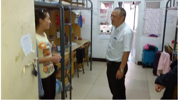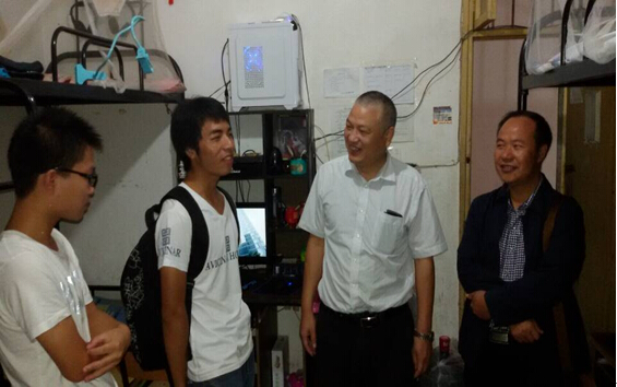 校领导一行还走访了一些学生宿舍慰问留校学生,与同学们促膝谈心,嘘寒问暖,亲切询问同学们的家庭情况和假期的学习、生活、工作安排等,并再三叮嘱同学们假期要注意安全。留校同学感谢学院领导来宿舍看望他们,并表示一定努力做好假期安全防范工作,不让学院领导、老师操心。