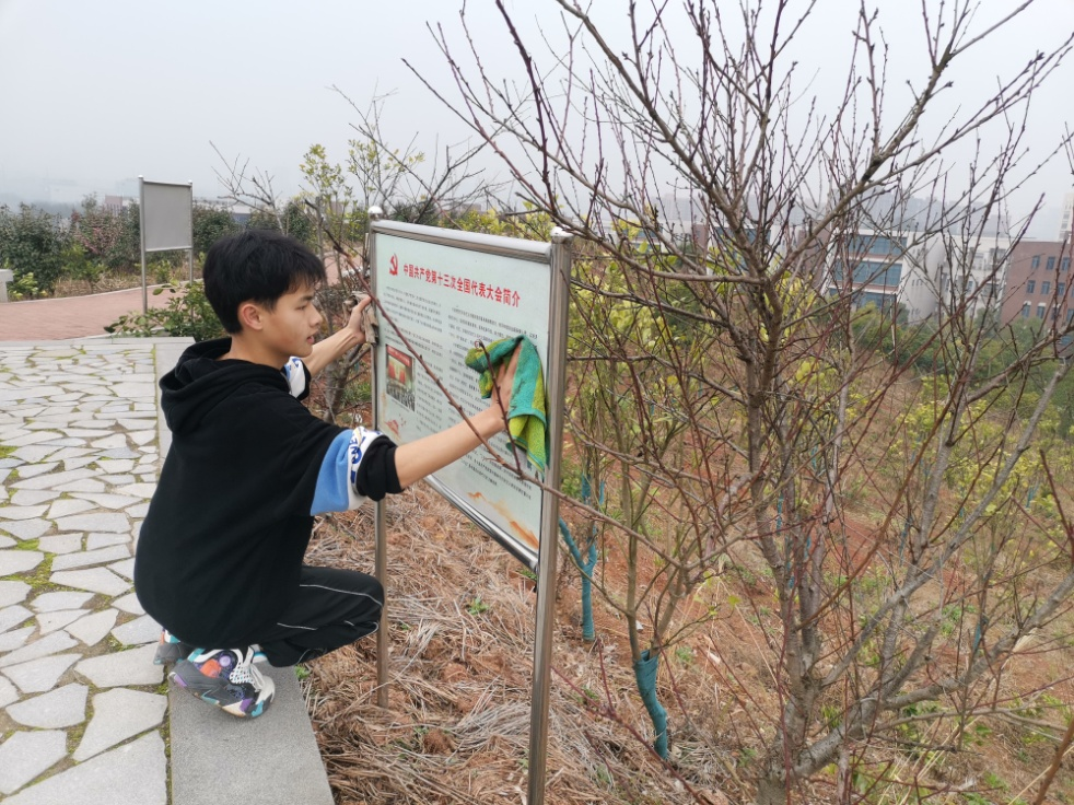 第一周开课的是机电21101-21106班同学,他们分布到学校外围、山坡、地下车库、学生宿舍等平时容易形成卫生死角的地方,分班分组承担劳动实践任务。三月的春风吹拂在校园,学校图书馆后山的党建公园也是劳动教育基地,只见同学们沿途打扫,认真捡拾垃圾,仔细擦拭着党建标牌和山上的亭柱。