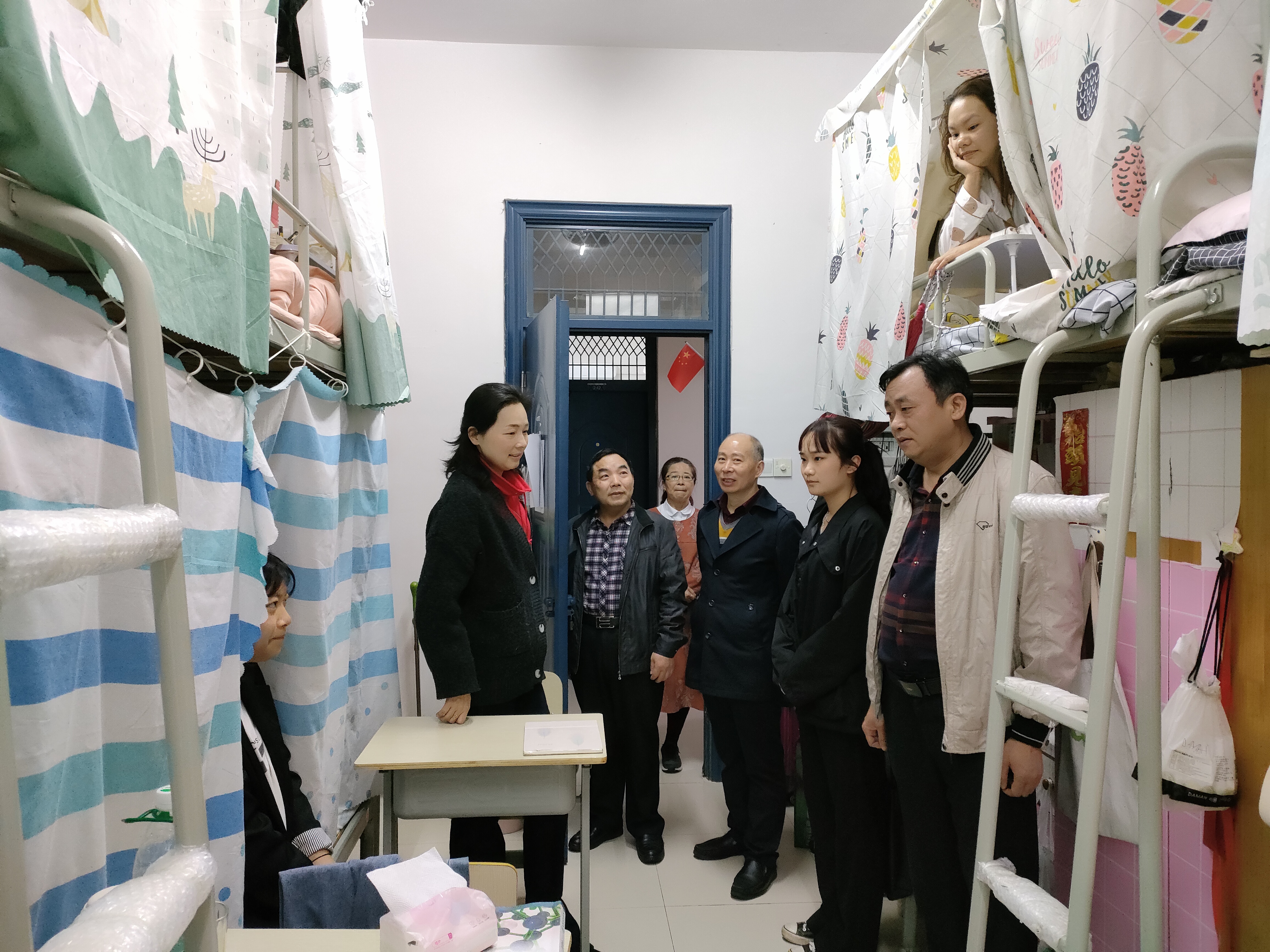 会后,支部全体成员到联系班级的学生宿舍,与学生面对面,了解学生生活情况和学生的期盼?!巴窃谏钌嫌惺裁蠢?,有什么需要帮助的,都可以和我们说,我们一定想办法为同学们解决困难?!薄疤炱浠?,同学们不要减衣服,不要感冒了?!薄耙词背苑?,多锻炼,学好专业知识,为国家发展贡献力量?!币痪渚湮屡幕坝铮瓜至酥Р客径匝墓鼗彻匦?,“一定为同学们解决困难”的承诺体现了支部同志“为学生办实事”的坚定信心。同学们纷纷表示,老师们的关心关怀让她们倍加温暖,一定努力学习,奋发图强,为服务国家富强、民族复兴、人民幸福贡献自己的一份力量。