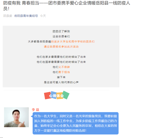 李益在第一时间自愿报名参加了此次战“疫”活动,他的工作是帮助爱心物资送到岳阳县人民医院和岳阳县汽车站两处“一线”战地。为了更快的将慰问一线防疫人员、志愿者的物资能够转载完毕,即使汗流浃背、腰酸背痛,也毫无怨言。志愿者们的行动得到了岳阳有关媒体的报道。李益同学表示,作为一名大学生,同时又是一名光荣的预备党员,要积极加入到防疫的一线工作中去,为家乡防疫工作贡献自己的力量,始终牢记全心全意为人民服务的宗旨,相信在大家的努力下一定能打赢这场疫情防控阻击战!