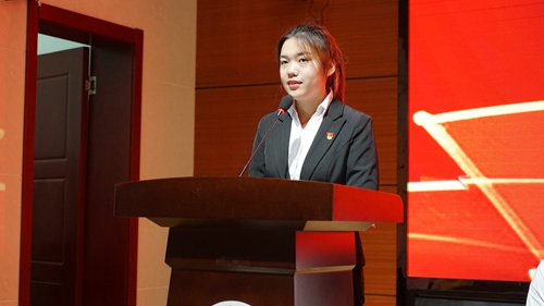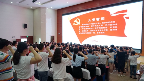 在组织部长张麦秋教授带领下,101名新党员进行入党宣誓,全体老党员重温入党誓词。制药与生物工程学院药学1617班张倩同学代表新党员上台发言。