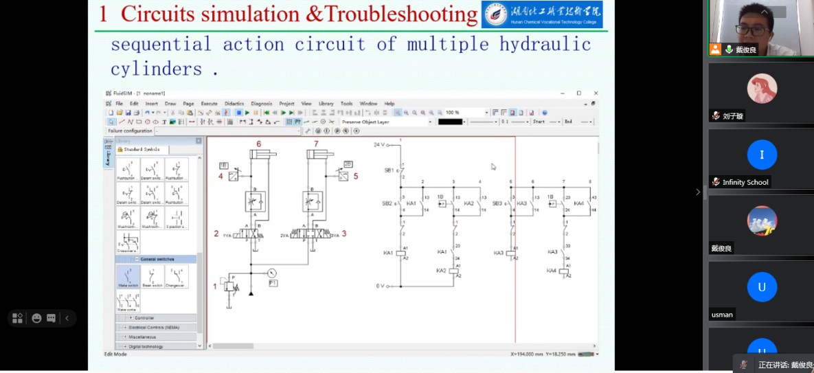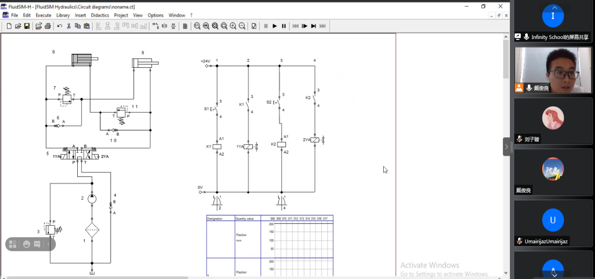 巴基斯坦Infinity工程学院是我校的友好合作院校,也是我校在巴设立的现代化工制药教学实训基地。Infinity工程学院8名学员曾来我??沽嘶ぁ⒒?、自动化专业的短期实训。今年7月,Infinity工程学院提出了液压软件培训需求,希望我校能尽快对其教师进行培训。我校校领导高度重视,立即组织了国际交流处、成培处、机电工程学院负责人碰头研讨合作方案,决定举办一期液压气动仿真软件(Fluidsim)线上培训班。时间紧、任务重,戴俊良老师作为此次培训讲师,在接到任务后便精心准备,认真制定教学计划,制作教学课件,克服困难,使得培训终于在暑期顺利开班。培训一共8天,共32学时,主要针对Fluidsim软件进行模拟教学,包括在fluidsim中绘制液压/气压/电气控制回路图和plc程序图,对回路进行模拟仿真,验证是否满足实际工况需求,对实际系统中的故障进行模拟分析,在软件中完成故障排查和修正等。目前,培训进程已过半,Infinity工程学院对此次教学十分满意,并已提出下一期培训的计划和需求。