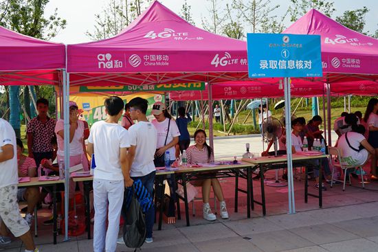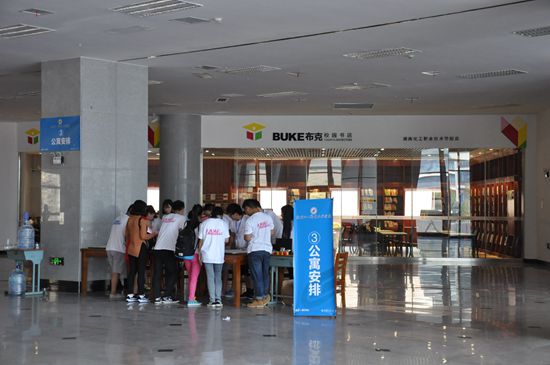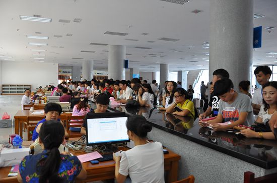 学院图书馆大厅是学院管理服务部门参加2015年校内迎新工作的主战场,在这里,学院招生就业处、财务处、学生工作处、团委、后勤处等管理服务部门都在在这里设置了迎新工作点,将录取信息核对、报到、公寓安排、缴费、办理IC用餐卡等新生报到入学手续实行“一条龙”服务,让新生在最短的时间内,就能完成报到入学。由于集中报到时天气比较炎热,学院全面开放图书馆报告厅,开设家长休息区服务新生和家长。