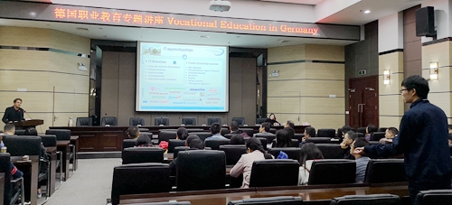 10月25日下午,由Nils Kraemer先生主讲的德国职业教育专题讲座在行政楼一楼会议室举行。副校长隆平教授主持讲座,各二级学院教学副院长、专业负责人、教研室主任及相关教师聆听讲座。Nils Kraemer先生介绍了德国职业教育体系,重点阐述了德国职业教育最具代表性的人才培养模式——学徒制,并以海因里希?赫兹职业学校为例,介绍了学徒制的特点及多种模式。我校多位教师与Kraemer先生开展了积极的互动交流。副校长隆平教授做总结发言,她指出,德国职业教育注重学生职业能力的培养,其独特的学徒制人才培养模式,是值得我们学习和借鉴的。