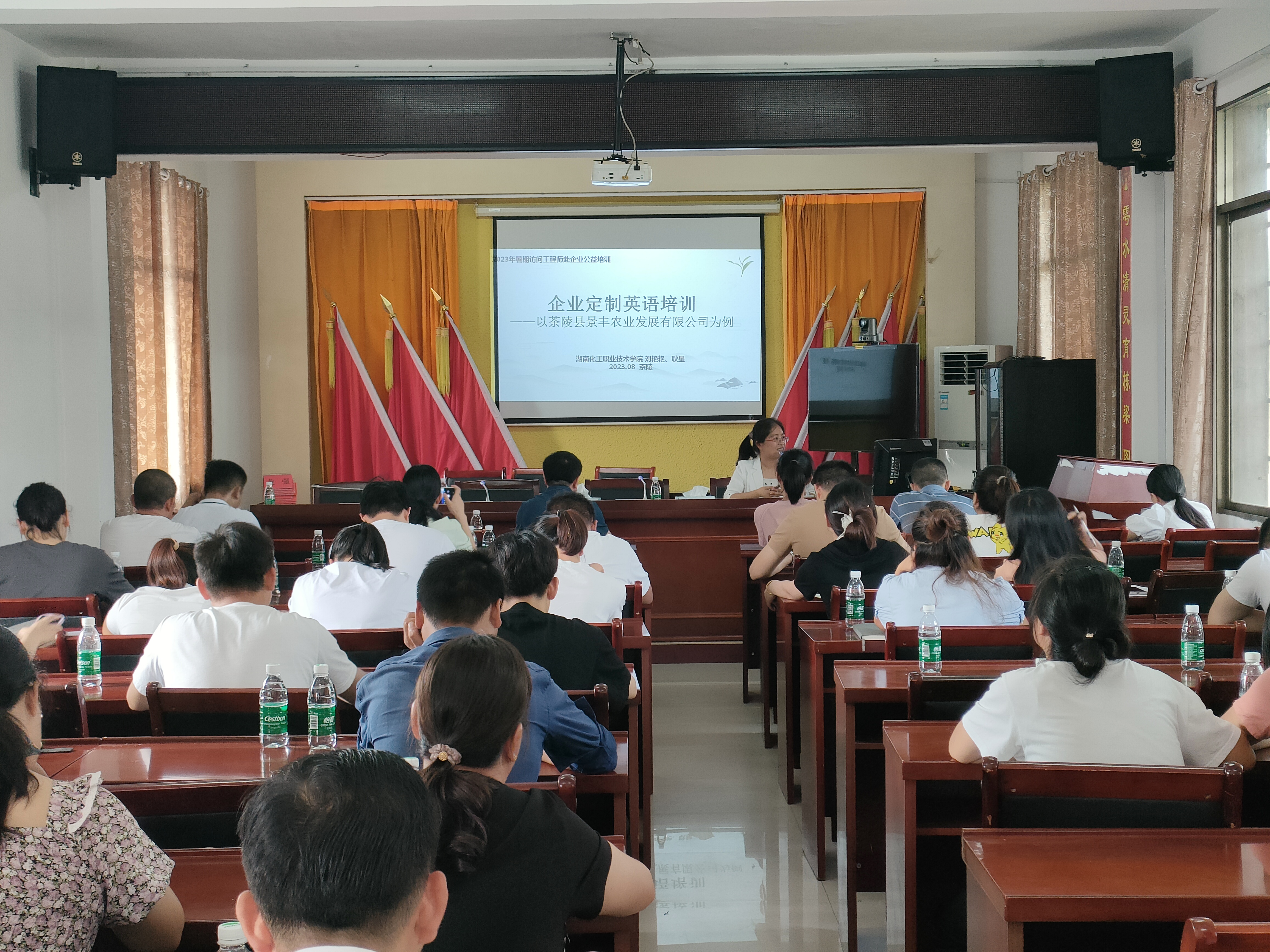 在讲授《企业定制英语》时,刘艳艳以在茶陵县景丰农业发展有限公司进行访问工程师的服务案例为例,通过讲授国内外茶人齐聚茶陵论茶,日常交际英语口语中问候与介绍、参访与接待以及茶叶产品名称的翻译和注意事项等,与学员们一同欣赏了两位访问工程师为企业定制的《茶园秋韵》双语短片,带领学员们共同感受“英语+中国茶文化”的独特魅力。