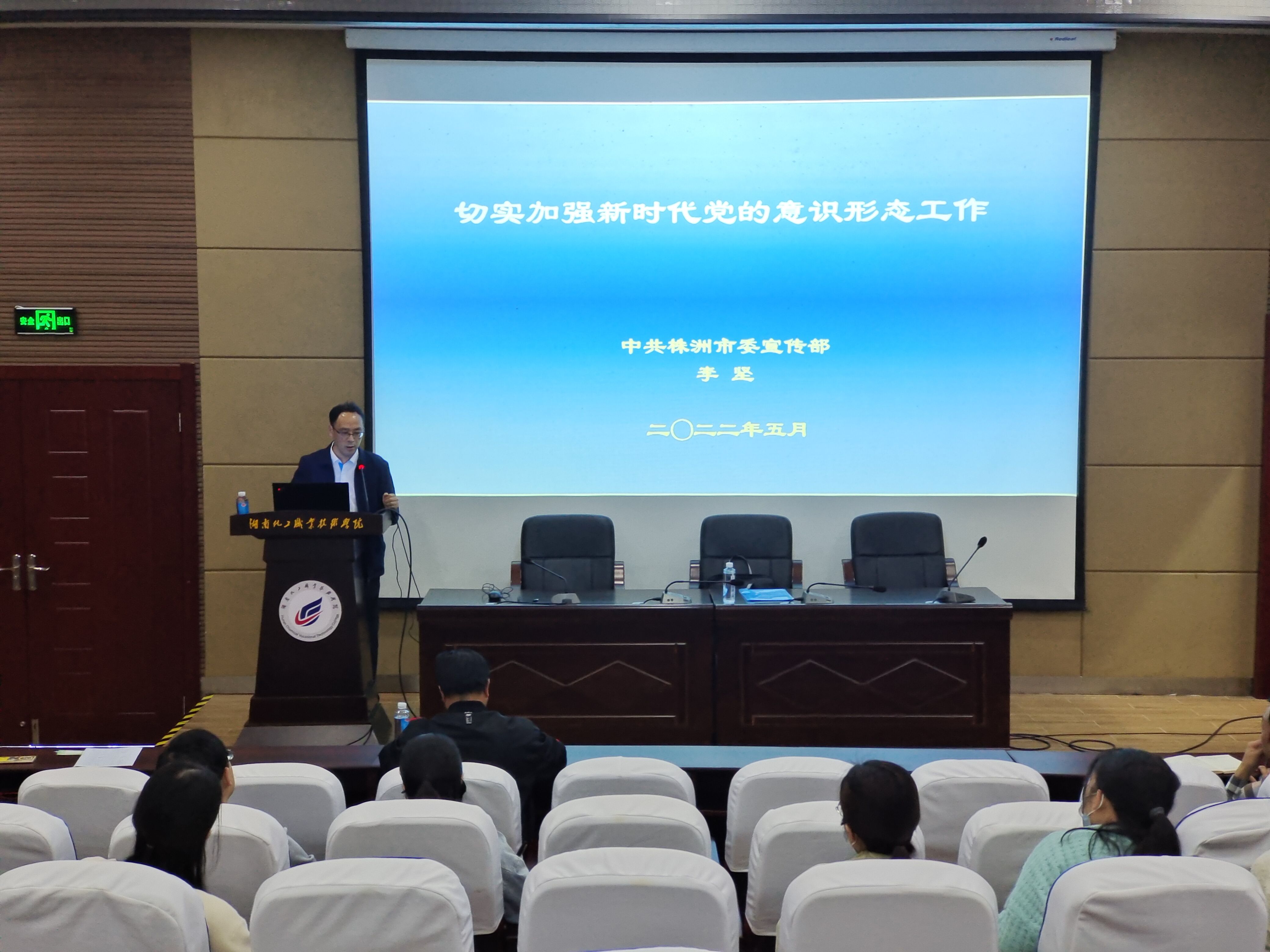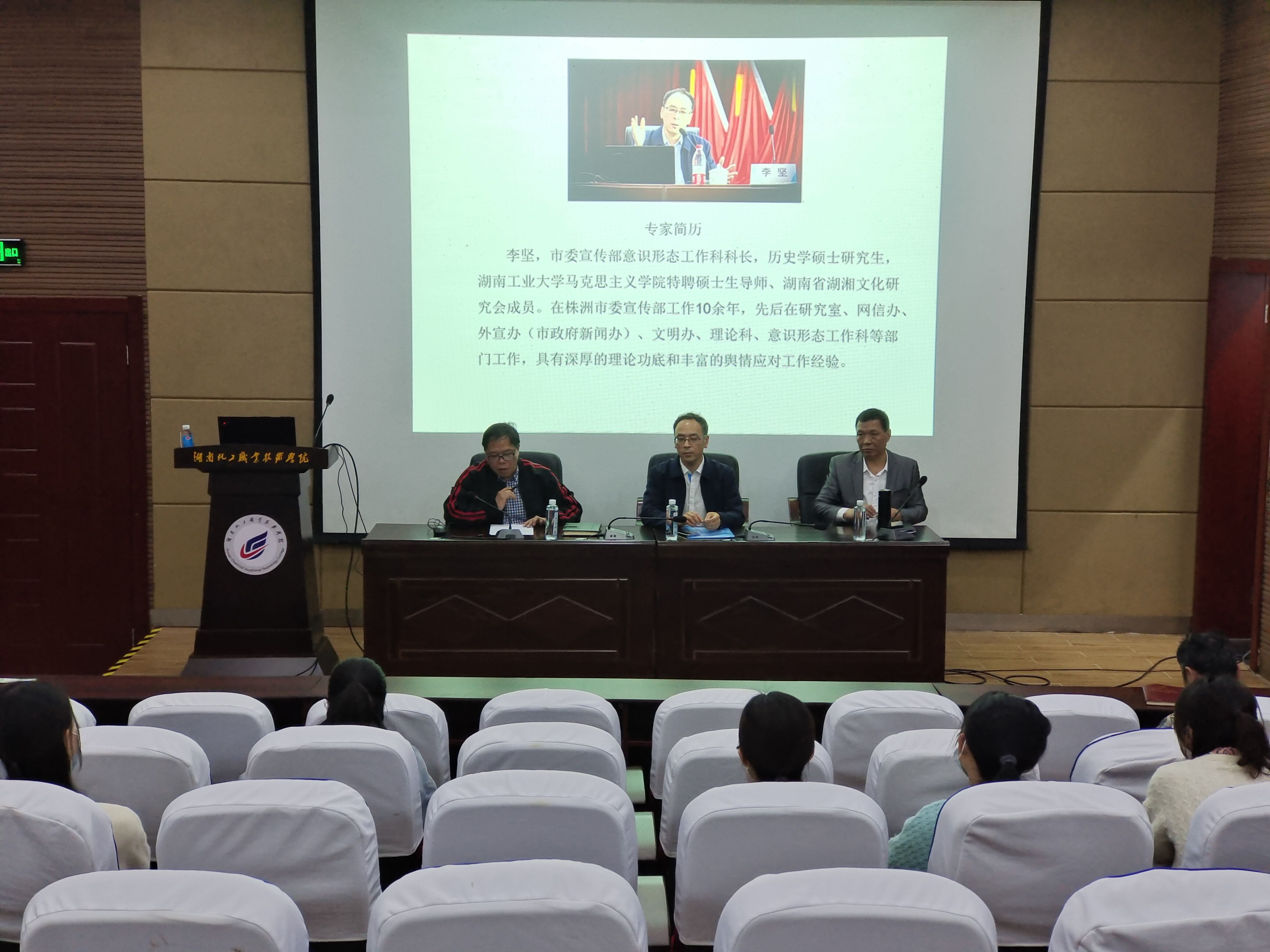 5月3日下午,湖南化工职业技术学院马克思主义学院举办意识形态专题辅导讲座。株洲市委宣传部意识形态工作科科长、湖南工业大学马克思主义学院特聘硕士生导师、湖南省湖湘文化研究会成员李坚受邀作题为《切实加强新时代党的意识形态工作》的专题辅导。讲座由马院党总支书记李纯斌主持并致欢迎辞,马院院长彭世武介绍专家基本情况,学校宣传统战部副部长谭件国和全体思政课教师参加专题辅导讲座。