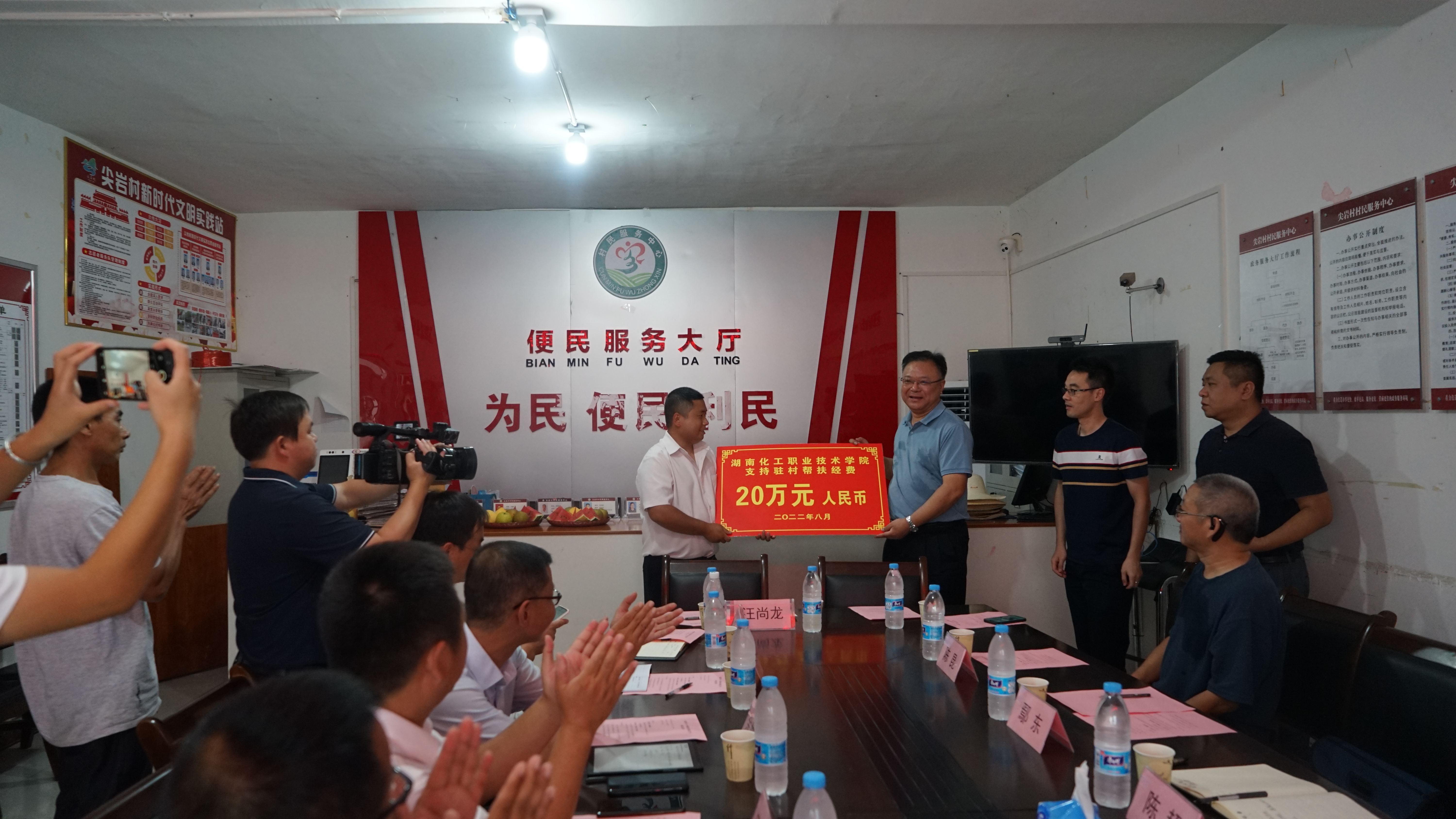 实地考察结束后,陈超一行来到尖岩村村部,围绕帮扶助力乡村振兴工作举行座谈会,会议由麻文君主持?;嵋橐潦?,陈超代表学校向尖岩村捐赠帮扶资金20万元。龙山县兴隆街道尖岩村党支部书记李兵代表省教育厅驻村工作队与村支两委向学?;卦跗?,对学校助力乡村振兴的真情帮扶致以诚挚感谢。