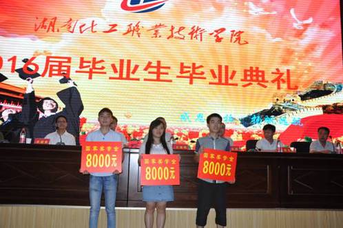 典礼上,石绍军宣读了我校2013级学生2014—2015学年度国家奖学金、励志奖学金获得者名单;游大庆宣读了湖南省2016届优秀毕业生名单。学校领导为获奖同学颁奖。