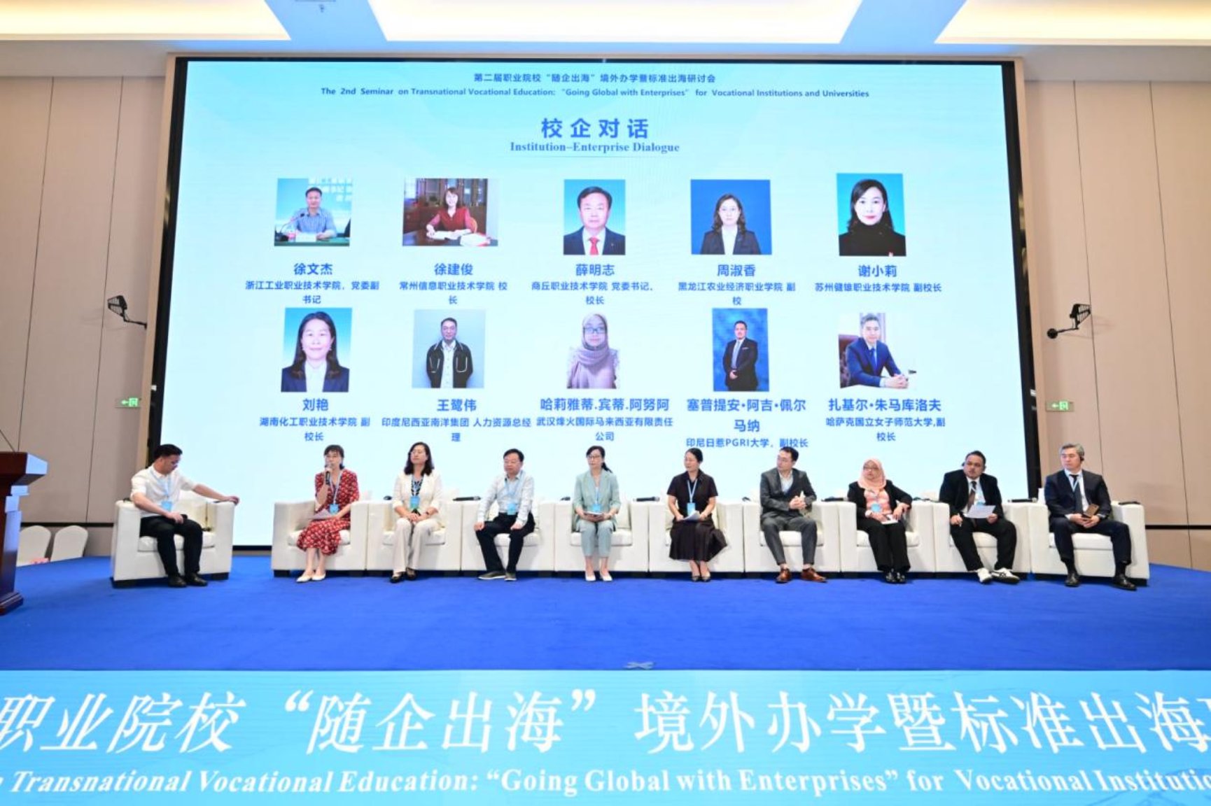 在高端访谈校企对话环节,刘艳介绍了学校发展历程,以及近年来在职教出海、留学生培养等方面所取得的成果。她表示,学校积极响应“一带一路”倡议,坚持教随产出,产教同行,持续开展属地技能人才培训,积极服务国际产能合作,并现场分享了学?!安倘诤稀焙汀八嫫蟪龊!惫ぷ鞯某晒?。