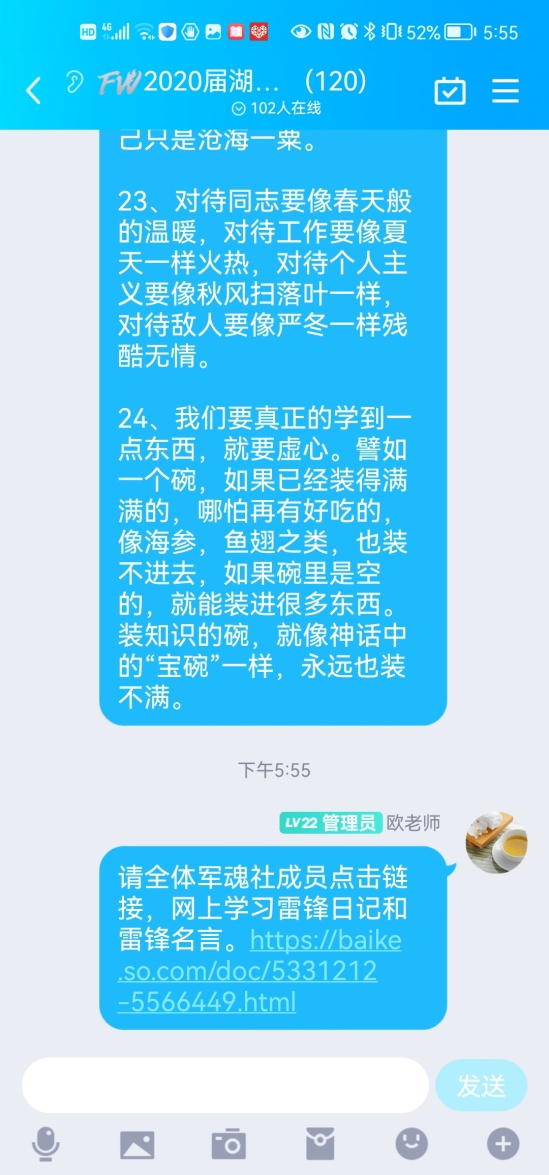 军魂社在网上组织学习《雷锋日记》。在雷锋日记中,不难看出他对毛泽东主席的文章和语录是真学真信真做的,进入新时代,面对新形势,重温雷锋日记,学习雷锋名言,我们可以看到他“对待同志要像春天般的温暖,对待工作要像夏天一样火热,对待个人主义要像秋风扫落叶般毫不留情,对待敌人要像严冬一样残酷无情。”这种旗帜鲜明的是非观。有发自肺腑的灵魂之问:“如果你是一滴水,你是否滋润了一寸土地?如果你是一线阳光,你是否照亮了一分黑暗?如果你是一颗粮食,你是否哺育了有用的生命?如果你是一颗最小的螺丝钉,你是否永远守在你生活的岗位上?如果你要告诉我们什么思想,你是否在日夜宣扬那最美丽的理想?你既然活着,你又是否为了未来的人类生活付出你的劳动,使世界一天天变得更美丽?我想问你,为未来带来了什么?在生活的仓库里,我们不应该只是个无穷尽的支付者。”