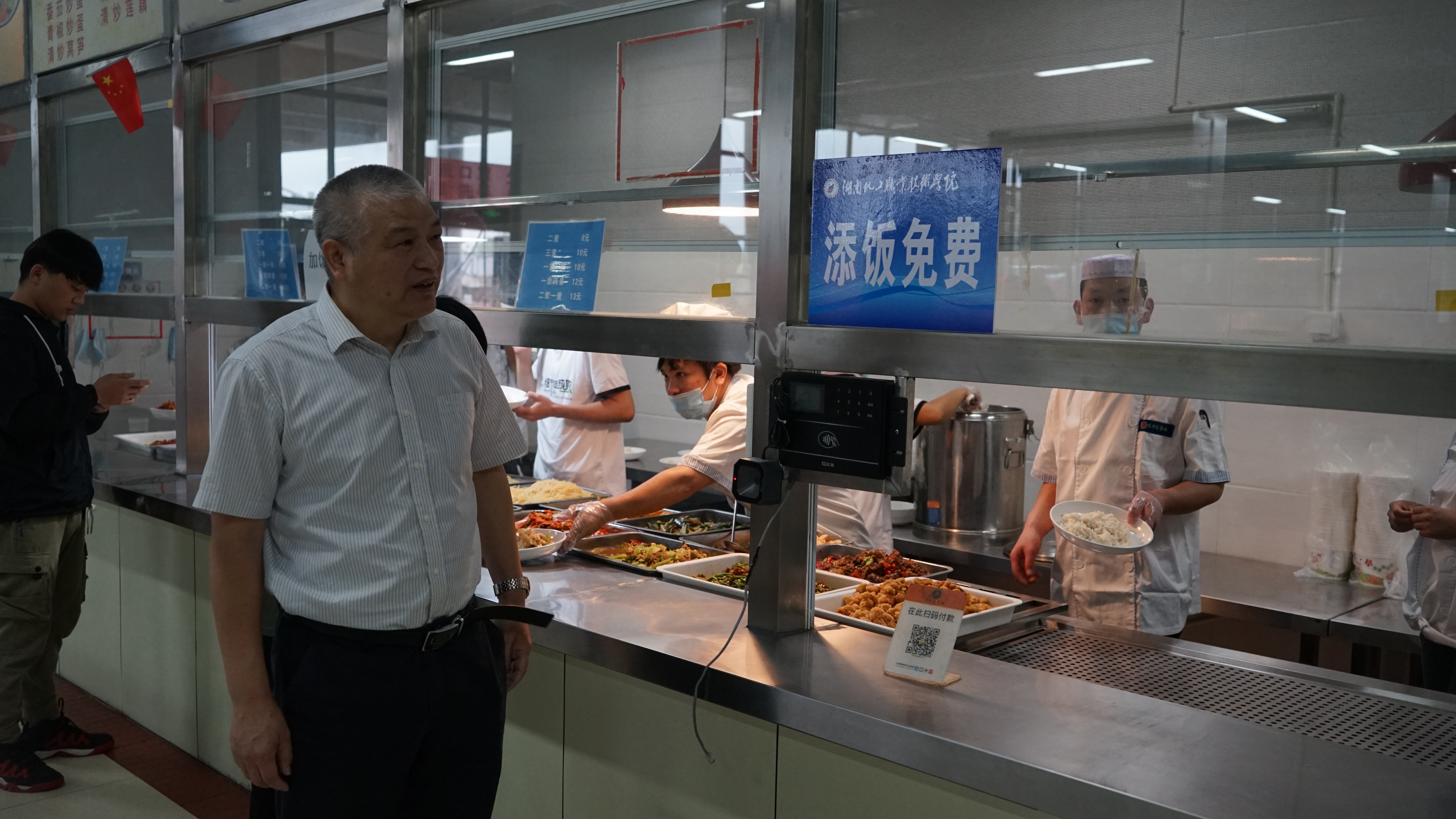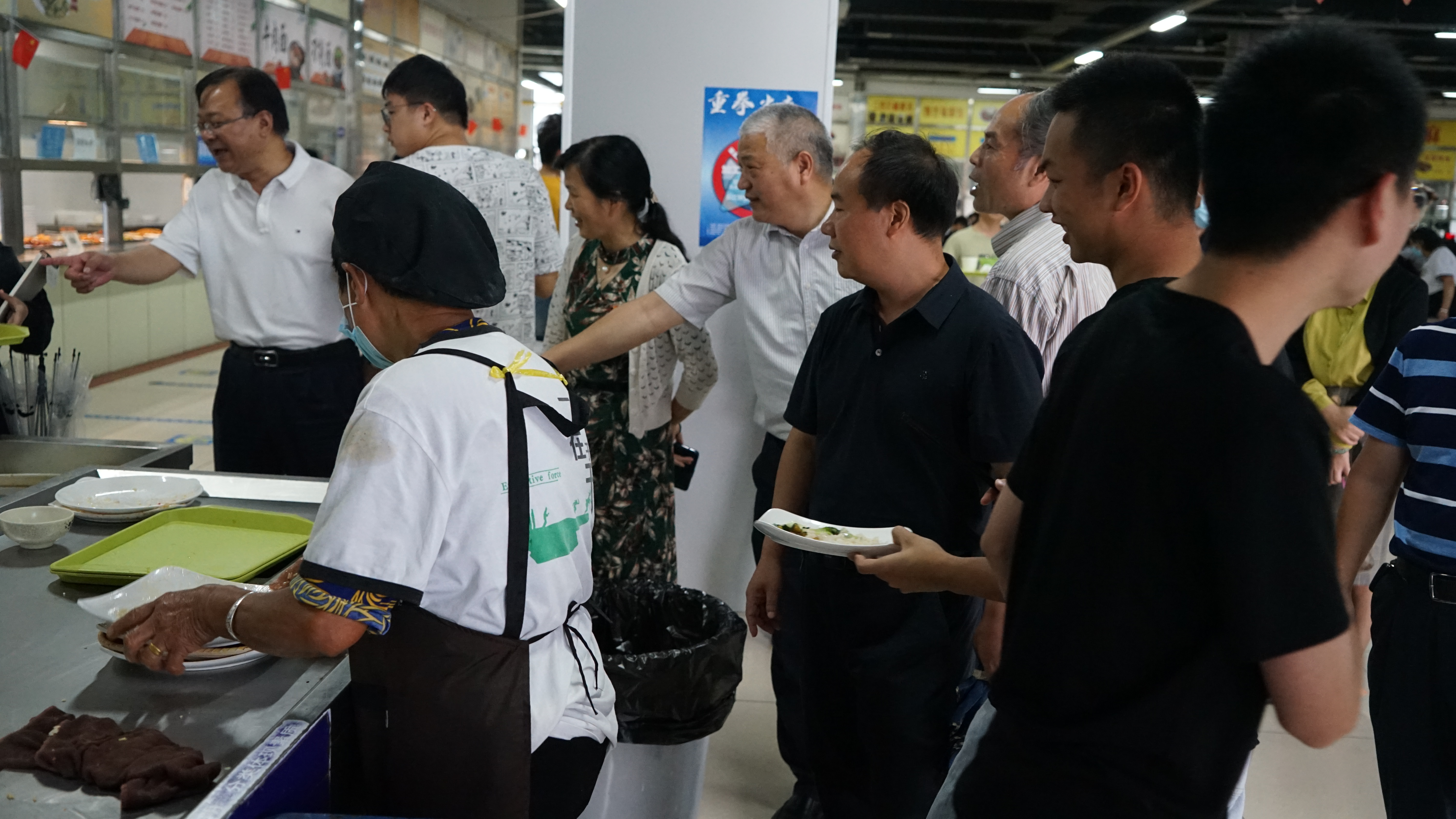 校领导逐层察看学生食堂饭菜的供应情况、饭菜质量、饭菜价格、食堂安全卫生、工作人员服务态度、学生就餐秩序、用餐高峰座位使用情况及文明就餐活动和“光盘行动”开展情况等。在学校二食堂二楼,粘贴了很多“添饭免费”的告示,校领导对这种提醒师生米饭按需打,避免浪费的方式表示赞赏。