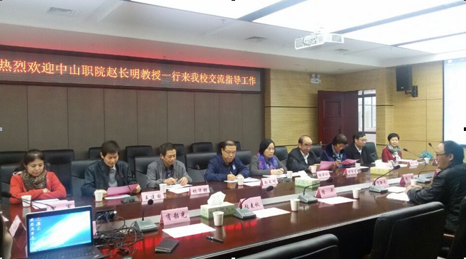 赵长明教授介绍了广东中山职业技术学院的教学督导情况,之后,与我院到会的教学督导员周剑教授、肖爱武副教授、龙朝副教授、吴子红副教授进行了热烈而友好的交流。