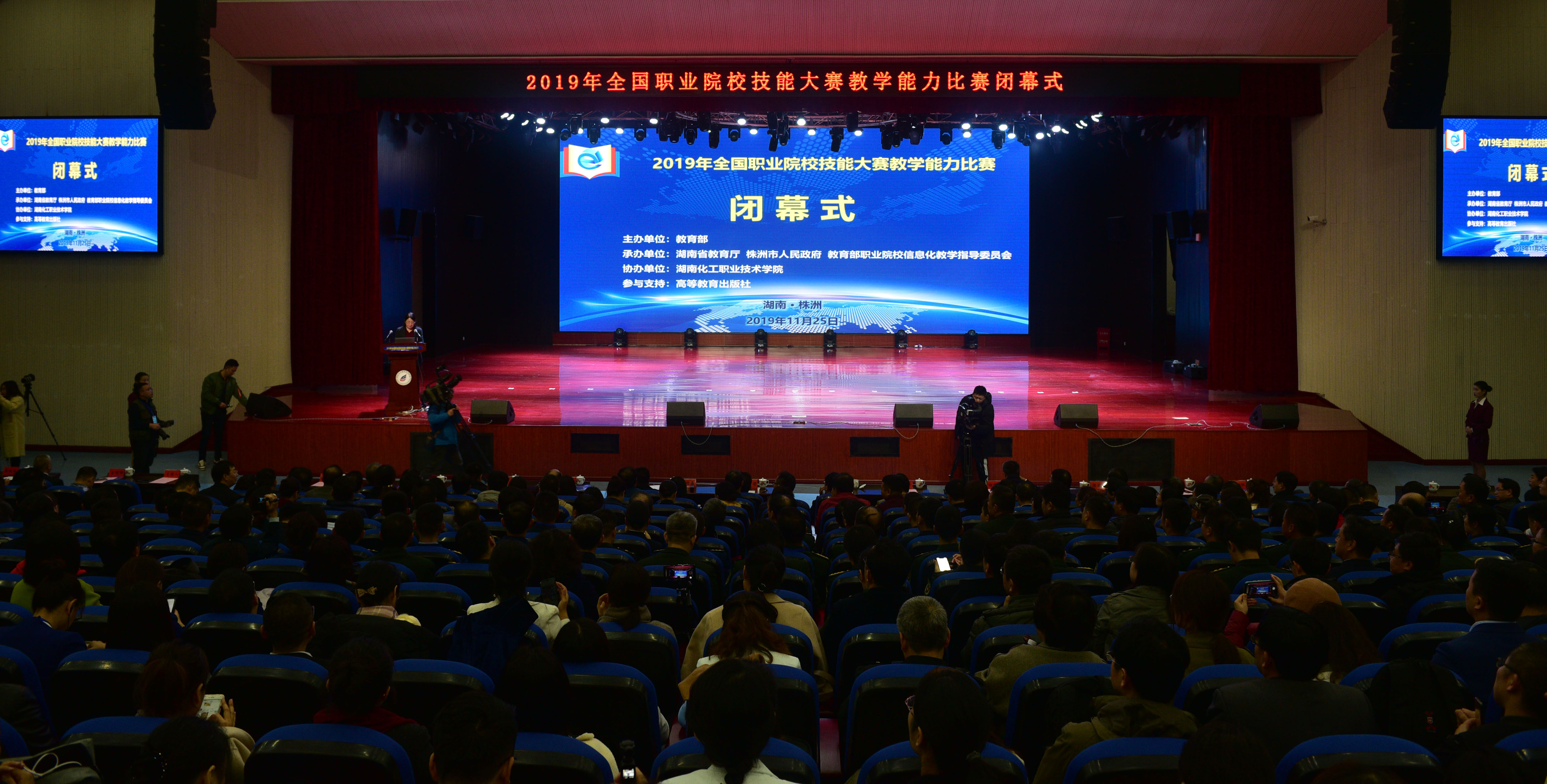 11月25日,为期三天的2019年全国职业院校技能大赛教学能力比赛现场决赛在湖南化工职业技术学院圆满落幕。教育部职业教育与成人教育司副司长谢俐,教育部职业技术教育中心研究所所长王扬南,湖南省教育厅党组副书记、副厅长、工委副书记王瑰曙,湖南省教育厅原巡视员、湖南省人民政府参事王键,株洲市人民政府副市长杨胜跃,高等教育出版社总编辑陈晓光,教育部科技司信息化处副处长任昌山,教育部财政部职教国培项目办副主任李新发,教育部职业院校信息化教学指导委员会主任委员、常州信息职业技术学院党委书记王钧铭,湖南省教育厅职业教育与成人教育处处长余伟良,株洲市教育局局长吴安浩,湖南化工职业技术学院院长王雄伟,高等教育出版社及有关部门领导,比赛执委会专家组成员、评委代表、各代表队领队、参赛教师,解放军和各?。ㄇ?、市)观摩代表,新闻媒体代表等,共计1700余人出席了闭幕式。闭幕式由湖南省教育厅巡视员应若平主持。