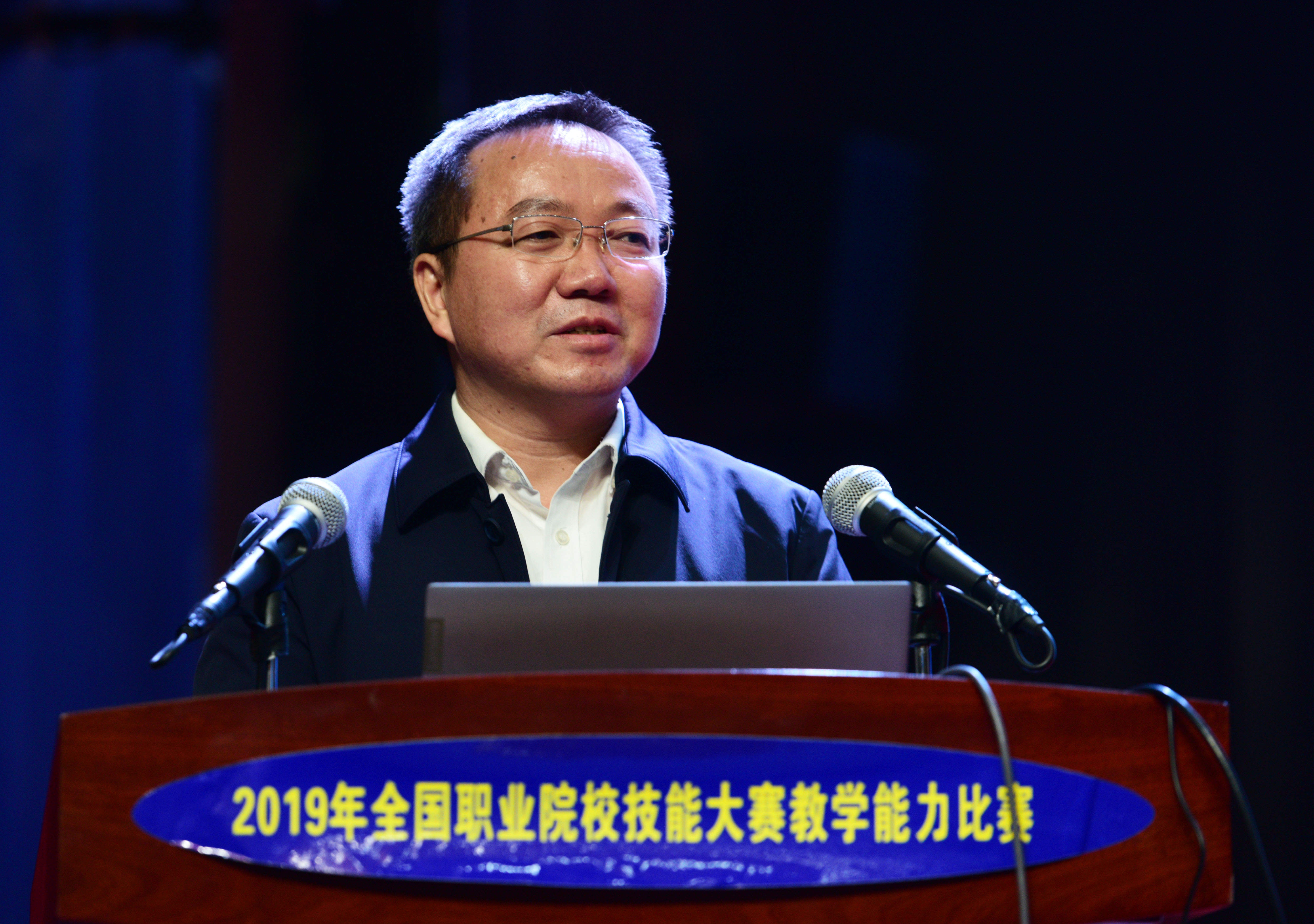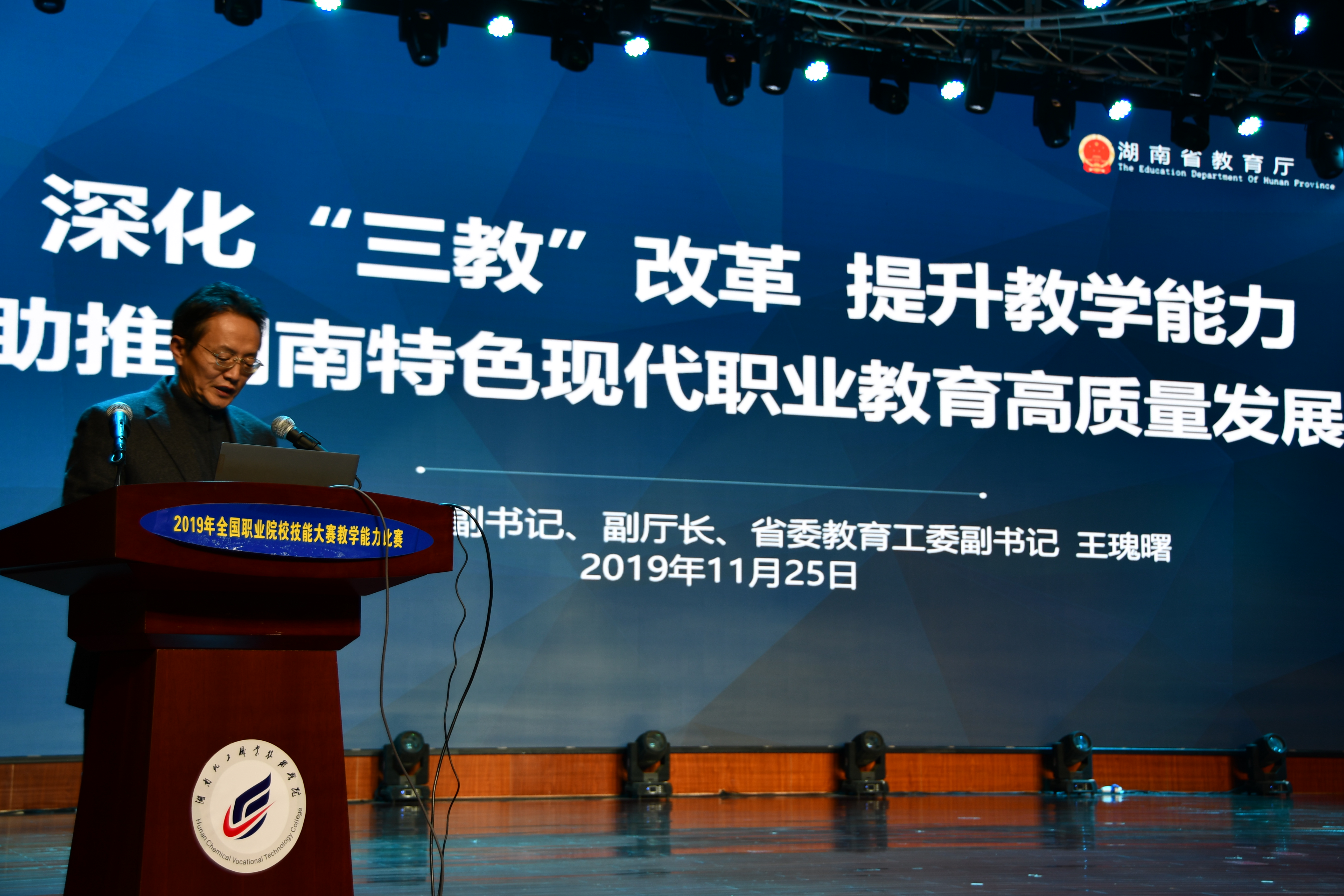 教育部职业教育与成人教育司副司长谢俐发表讲话。他指出,本届比赛是职业教育战线全面贯彻落实《国家职业教育改革实施方案》的第一年,也是全国职业院校技能大赛教学能力比赛实施全新方案的第一年,还是大赛举办的第十年。他代表比赛组委会和教育部职业教育与成人教育司向所有获奖教师、专家、工作人员表示感谢,对共同打造比赛盛事的中央军委训练管理部,教育部教师工作司、科学技术司、职业技术教育中心研究所,国家开放大学,中央电化教育馆,株洲市人民政府,教育部职业教育信息化教学指导委员会以及协办单位表示衷心感谢,对大赛取得的新进展、新成果和新突破感到欣慰。他强调,近年来以习近平同志为核心的党中央把职业教育摆在了前所未有的突出位置。2019年印发《国家职业教育改革实施方案》,召开全国深化职业教育改革电视电话会议,进一步明确改革完善职业教育制度体系,深化产教融合,加快培养国家发展急需的各类技术技能人才。关于如何正确认识职业教育改革发展新要求,准确把握新时代职业教育的责任使命,谢俐提出三点考虑:一是要学习贯彻国家对职业教育发展提出的新观点新定位;二是要准确把握职业教育面临的新形势新任务;三是要深刻认识职业教育大改革大发展对教师提出的新功能新要求。闭幕式上,谢俐对2019年教学能力比赛取得的成绩给予高度肯定,并就着力深化“三教”改革,全面提高技术技能人才培养培训质量提出明确要求:一是不忘初心、牢记使命,落实立德树人根本任务。要全面推进社会主义核心价值观进教材、进课堂、进头脑,健全“三全育人”机制;二是贯彻标准、严谨治学,全面夯实专业育人成效。专业人才培养方案要对接国家教学标准,对接产业发展趋势和行业企业人才需求,全面把握人才培养规格、专业内涵;三是要主动提升、协同奋进,建设高水平教学创新团队。进一步加强教学团队建设,培育团队教学能力,探索组建高水平、结构化教师教学创新团队,教师分工协作进行模块化教学;四是要融合创新、潜心育人,扎实推进教法改革。把握教书育人、学生成长规律,积极开展项目教学、案例教学等适合职业院校学生的教学模式,探索具有工学结合、知行合一的教书育人机制;五是要顺势而为、乘势而上,致力推动信息技术与教育教学深度融合?;剿骰谌斯ぶ悄?、大数据、虚拟现实的新教学模式,基于大数据的多维度综合性智能评价。