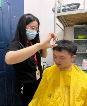 连日的疫情管控,渐渐蓄长的头发,在校内理发成为了同学们关心的“头”等大事。为了解决学生理发问题,4月6日上午9:00,蒋宇涵老师通过自学理发技术化身“Tony”老师来到学生宿舍为同学们解决 “头”等大事。一把电推剪、一把发剪、一把梳子、一件围布,蒋老师装备齐全地在学生宿舍开起了“免费发廊”。在得知提供免费服务后,同学们都热情高涨,纷纷前来体验这“别样的幸福”。蒋老师将理发工具仔细消毒后,动作娴熟地开始为学生理发。“前面要不要打薄一点?”“后面要不要再剪短一点?”“放心吧,不会剪残的”......蒋老师一边理发一边安抚同学们紧张的小情绪。原本学生凌乱的发型,在一双巧手下,变得干净利落。手艺虽不及专业理发师,但蒋老师的亲力亲为,为同学们换来了清爽的发型。同学们都纷纷表示感谢,有一位同学甚至表示这大概是他大学里最珍贵的一次理发。