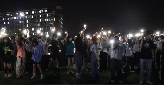 疫情就是命令,防控就是责任。为了做好疫情防控,学校不得不进行封闭式管理,同学们也少了很多的校外娱乐活动。为了丰富课余文化生活,提高同学们的身体素质,蒋宇涵老师组织班上同学在操场开展校园广场舞活动。封闭式管理却封不住同学们对生活的热爱与青春的朝气,绿地草坪,音符跳动。4月8日晚上7:30,随着《酒醉的蝴蝶》《最炫民族风》《小苹果》等广场舞热门歌曲响起,同学们都戴好口罩不约而同地来到足球场的正中央。动人的旋律,富有节奏感的步伐,同学们沉浸其中,慢慢找到了浪漫,找到了自己……