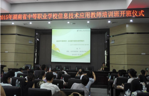 7月25日上午9点,2015湖南省中职教师信息技术应用培训湖南化工职业技术学院培训点开班仪式在我院办公楼一楼会议室顺利举行。我院副院长隆平教授,教务处、督导室负责人以及我院培训点各位培训师和来自湖南省各地州市参加此次培训的中等职业学校的108位教师参加了开班仪式和专题讲座。