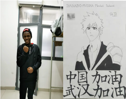 刚果留学生马卫为中国加油,右图为马卫作品
