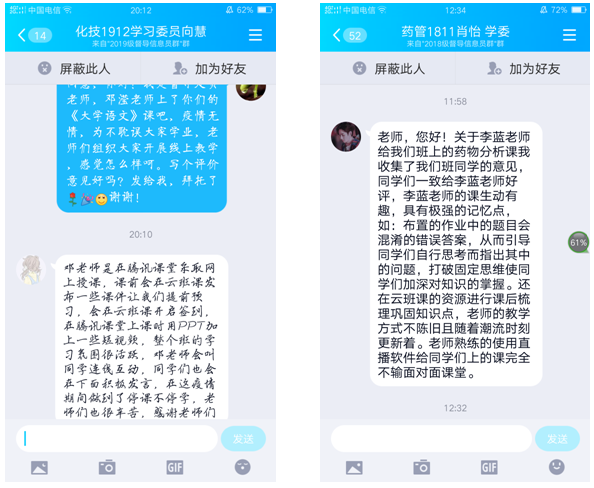 接着,各听课小组组长在收集组内每位教学督导员评价后分别作出综合评价反馈意见,既肯定被听课教师线上教学的作法也诚恳的毫无保留地指出其改进点,同时,组内其他教学督导员作适当补充。龙朝对徐祥斌老师任课《中药制剂技术与设备》的评价反馈意见中肯定了“结合当前疫情有关口罩生产线为案例,资源丰富,视频演示,直观教学,诙谐幽默,学生喜欢”为特点;李菡对陈志雄老师任课《视频编辑》的评价反馈意见中指出了“融合课程思政正向引导学生三观,课前课中双考勤关注学生在学状态,操作娴熟言简意赅直指要领”的特征;唐新军对言雅娟老师任课《广告学》的评价反馈意见中肯定了“案例分析和情境化教学相结合,学生线上讨论做到主体作用充分发挥”的作法,吴子红对戴俊良老师任课《液压与气压传动》给予“现场经验丰富,6S管理融入教学,通过视频播放直观表达结构和原理,课堂测评佳”肯定;肖爱武对欧阳志红老师任课《自动化生产线技术》的评价反馈意见中指出了“资源丰富,视频播放涡流效应一目了然,将问题置入云班课进行轻直播讨论并结合腾讯课堂声控学生在线及参与程度尽在掌握,学生参与活动综合评价雷达图丰满”特色;肖韶光对谭大喜老师的任课《车工工艺学》的评价反馈意见中高度赞扬 “退休干部、老教师运用腾讯课堂+云班课线上教学,操作娴熟运行流畅,PPT课件精美,视频播放直观易懂,功底深厚手绘笔描,循循善诱效果优良”;蒋俊凯对李蓝老师任课《药物分析》的评价反馈意见中概说“声音甜美、师生融洽,互动热烈,关注学生在线学习状态,将安全教育与职业素养融入教学,目标明确,重点突出,化繁为简,启发引导,效果优良”为长处;贺新元对邓滢老师任课《大学语文》的评价反馈意见中提出了“课程思政、育人为本、自主学习的教学理念设计教学,有效拓展学习时空,课前预习,课上内化提升,精美的课件,丰富的素材,精心设计的问题,激越的表达让学习者深受感染,师生关系融洽互动热烈,云班课学习活动设计多样,学生查看率高,学生活动综合评价雷达图较丰满,成效显著”为特色。此外,被听课教师的线上教学得到了居家在线学习大多数学生的高度认可,化技1914夏爱良同学说:“邓(滢)老师的课生动有趣,富有感染力,让原本不太关注古诗词的我们越发喜欢?!?;化技1912向慧同学说:“邓(滢)老师是在腾讯课堂采取网上授课,课前会在云班课发布一些课件让我们提前预习,会在云班课开启签到,在腾讯课堂上课时用PPT加上一些短视频,整个班的学习氛围很活跃,邓老师会叫同学连线互动,同学们也会在下面积极发言,在这疫情期间做到了停课不停学,老师们也很辛苦,感谢老师们”;药管1811肖怡同学说:“关于李蓝老师给我们班上的药物分析课我收集了我们班同学的意见,同学们一致给李蓝老师好评,李蓝老师的课生动有趣,具有极强的记忆点,如:布置的作业中的题目会混淆的错误答案,从而引导同学们自行思考而指出其中的问题,打破固定思维使同学们加深对知识的掌握?;乖谠瓢嗫蔚淖试唇锌魏笫崂砉讨兜?,老师的教学方式不陈旧且随着潮流时刻更新着。老师熟练的使用直播软件给同学们上的课完全不输面对面课堂?!?;药管1811卿佩同学说:“药管班评价意见:挺好的,(李蓝)老师上课是用线上QQ视频通话,不卡也很流畅,同学们上课也很积极,参与度高?!敝幸?/span>1811赵荣福同学说:“徐祥斌老师的课上得很好,讲解重点的时候会反复提问,让我们记住,课前和课后也会进行签到,在上课过程中的互动也挺好的,上徐老师的课会感到轻松,氛围挺好的?!敝幸?/span>1811蔡蕊同学说:“徐祥斌老师的课比较轻松。有疑问的地方及时在直播下反馈他会很及时的讲解。他平易近人,对我们热情,有时挺幽默 ,网课上课氛围也活跃?!钡缟?/span>1811张思佳同学说:“陈(志雄)老师教学非常幽默和细心,言(雅娟)老师有耐心并且也很细心,(他们)教学都非常好”; 电商1812聂敏同学说:“因疫情开展线上教学,陈志雄老师上课特别有活力带动课堂气氛,讲课也比较细致,同学们也积极回答课堂问题,深受全班同学喜爱;言雅娟老师讲课也比较负责任,都挺不错的”。同时,同学们也提出了希望,化技1914夏爱良同学说:“希望老师每节课能让几位学生发言,适时的评价并鼓励他们继续探讨,给我们的思想插上翅膀,有利于我们思维的发展。但是由于我们其它课程网上授课的方式以及网课等,作业对于我们来说有点繁重,希望老师能够结合我们的知识层面,出一些比较适合我们的题?!敝幸?/span>1812彭菁菁同学说:“由于同学们网络的原因线上教学多多少少都会有些影响,我们还是希望快点开学”。