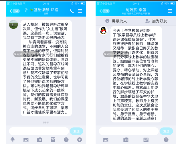 与会教师对本次在线督导听课评价反馈会反响强烈,曾两次获得全国高职院校教师教学能力大赛一等奖邓滢老师这样说:“从(任职)入校起,被督导听过很多次课,但作为“女主播”被听课,这是第一次。说实话,我又有了新老师般的忐忑——毕竟隔着屏幕、没有眼神交流的课堂,不同的人会有不一样的感受。但同时我也很期待专家同行们能给我更多不同的听课体验。与以往不同,这次的督导在线听课反馈也非常地隆重有创意!我不仅听取了专家们给予我的改进意见,也学习到了其他被听课老师的好方法??梢运滴沂嵌降继揽位葡鲁沙て鹄吹囊幌呓淌?,我们的教育需要适应新时代、新发展,我们的课堂也需要不断地优化教学方式,固步自封不可取,集思广益才能使教学更有活力?!?;医药专业出身的李蓝老师在疫情非常时期有着特别的情结,她说:“今天上午学校督导组织了“教学督导员线上教学听课评课在线反馈会”,作为昨天被听课的教师,既紧张又期待,紧张自己昨天的教学设计还可以优化,期待老师们分享线上教学的法宝秘笈。细细品味各位督导老师的发言,真为他们的细心、爱心、精心感动,对上课老师发布的资源细心查阅,为各位老师的线上教学爱心献策,在学校线上教学的实践中精心规划。白衣战士用逆行的脚步筑起了平安的长城,激昂的战歌在中华大地上回声嘹亮,教师身上有沉甸甸的责任,这次反馈会让我感受到了化院人的勇于挑战,勇于担当,勇于创新,前进的道路一定越走越宽!”;谭大喜老师说:“这次线上教学反馈会开得很好,我自始至终一直在听,通过对老师们的点评,从中学到很多东西。如果能让每个班选个代表加入反馈点评,可能更精彩?!?;言雅娟老师说:“我觉得督导的意见很中肯,其他老师也有很多值得我学习的地方。比如如何对学生的线上听课情况进行实时监测;如何将不同教学平台进行无缝衔接;上课的时候如何融入时事和思政教育,这些都是我在后期教学当中要注意改进的?!?;徐祥斌老师说:“我非常有幸上午全程听了校督导专家的点评,感觉受益匪浅,不仅仅是听了专家们对我的课堂的点评,而且还学习了其他老师的课堂经验,对自己教学是个很大的提高。 因为各种原因,基层教师常常在经验交流上做的不够,深入其他教师的课堂不多,而这种听课以及听课评价的方式可以很好弥补这种不足,而且能够在短时间内提供大量的信息和经验。感谢校督导处组织地这次活动,感谢学校督导老师对我的真挚中肯点评,感谢其他老师奉献的精彩课堂经验。”;陈志雄说:“不断探索线上教学的组织方法,追求线上教学的良好效果,强化教学质量控制,提升学校内涵,每位老师都在努力。感谢督导老师的辛勤工作,把提升内涵这个口号落到实处!”;戴俊良老师说:“作为一名新进教师第一次上课,能收到督导处各位专家领导的评价反馈,非常荣幸。各位专家指导非常诚恳全面,为我后续的教学改进提供了方向。同时,在今天的反馈会上,专家们还介绍了其他老师的优秀经验,也受益匪浅。通过线上督导和反馈交流,保证我们听课不停教,质量也不降”。