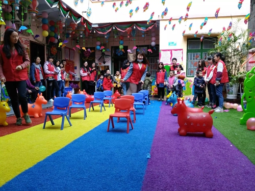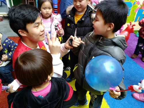 志愿者给小孩子们表演了手语舞蹈“爱”,孩子们跟着节奏轻轻的拍手,有些孩子还手舞足蹈地跟着志愿者一起跳了起来。在玩游戏的时候,玩到“接力赛”时,有速度飞快的,有不紧不慢的,还有赖皮抄近路的,也有临阵脱逃的……千姿百态,把在场的老师家长都逗乐了。
