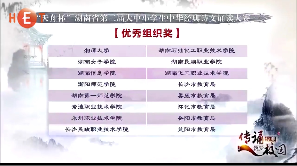 本次大赛由湖南省语言文字工作委员会、湖南省教育厅主办,以“传颂经典,筑梦校园”为主题,引导学生自觉传承弘扬中华优秀传统文化,营造浓厚校园文化氛围,让青少年学生在中华经典诗文中追求诗与远方,联通历史与未来。大赛分为初赛、复赛和决赛三个环节,历时六个多月。比赛设有小学组、中学组、高职组、本科组和留学生组,全省共有500多所大中小学校参赛。最终,共决出一等奖14项,二等奖21项,三等奖32项,优秀奖若干,并按比赛成绩占45%,初赛组织占55%的评分标准,评出了16个优秀组织奖。