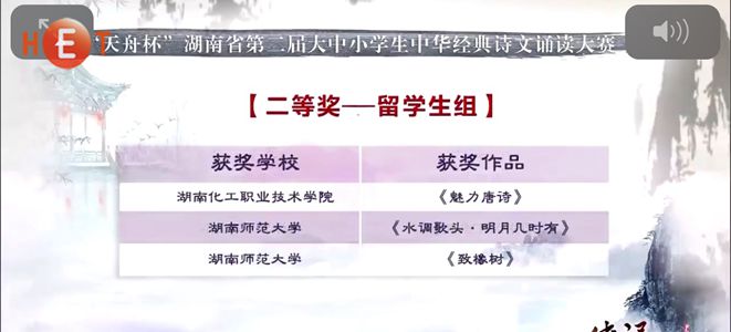 12月6日晚,湖南省第二届大中小学生中华经典诗文诵读大赛决赛在湖南省群众艺术馆落下帷幕,此次比赛由湖南教育电视台全程直播。我校选送的作品《魅力唐诗》荣获留学生组二等奖,学?;竦糜判阕橹薄?
