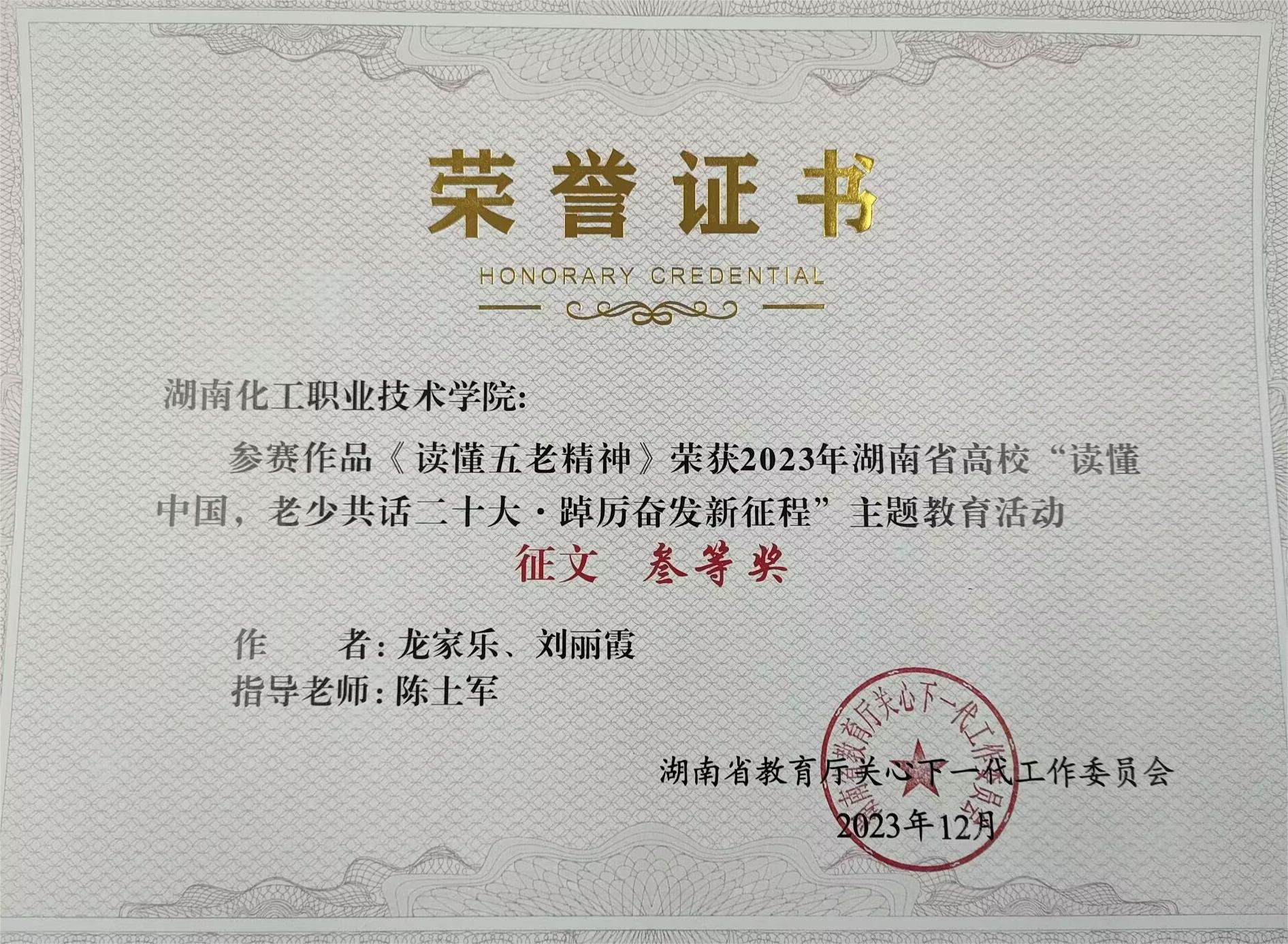 日前,中共湖南省委教育工委下发了《关于 2023 年全省普通高校“读懂中国” 主题教育活动作品评选结果的通报》。我校由陈土军老师指导,学生龙家乐、刘丽霞的作品《读懂五老精神》和唐子茵老师指导,学生梁金奎的作品《我的篇章为她而写》获得征文类三等奖。