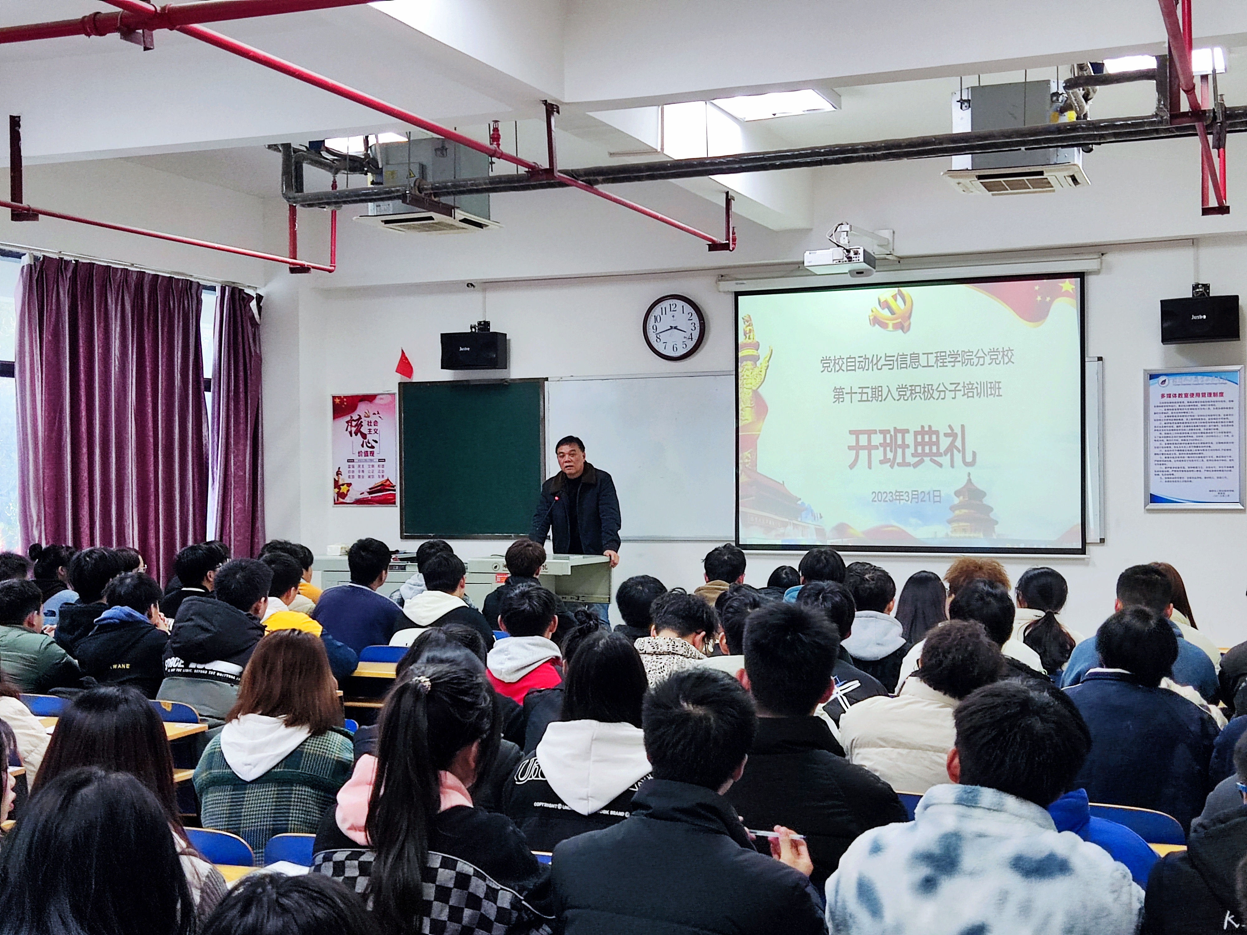 为从源头上严把党员发展“入口关”,加固发展党员“蓄水池”,切实做好入党积极分子的培养教育工作,提高入党积极分子的思想政治素养,自动化与信息工程学院于3月21日在笃学楼109教室举行了第十五期入党积极分子培训班开班典礼。本次开班典礼由自信学院党总支专职组织员何涛主持,自信学院党总支书记许建平、党总支副书记郭浪莅临指导。