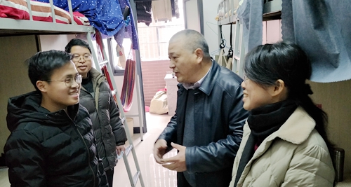 2月24日,是我校学生新学期返校正式报到的日子。上午11点,刚刚开完会的校长王雄伟,匆匆走出办公楼,在副校长胡颖蔓和督导处处长贺新元、学工处处长朱海军等相关职能部门负责人陪同下,前往学生宿舍看望返校学生。