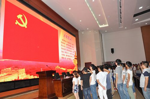 在鲜红的党旗下,71名新党员同志激情饱满地进行入党宣誓,制药与生物工程系分析1311班刘莹同学作为新党员代表上台发言。