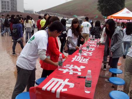 “用一张小纸条,写上你的信息和祝福,装进一个废弃的塑料瓶,就可以‘漂’到全国200多所高校”。在校园里,环保协会的成员们竖起展板,向同学们发放传单,倡议同学们参与高?;繁!捌髌俊被疃?。