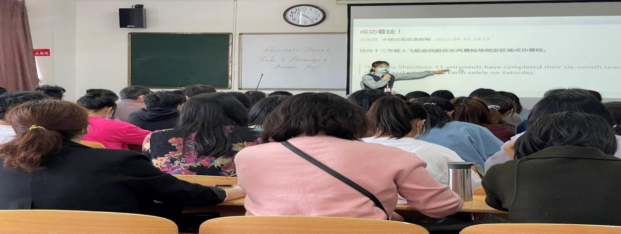 本次进行教学展示的是大学英语教研室的专任教师刘艳艳,授课内容为《Arranging Business Trip》??翁蒙?,她充分运用信息化教学手段,以视频、图片为媒介,精心设计了“新闻引入、旅行分享、文化讲解、学生展示”四个教学环节。结合三名航天员返回地球的时事新闻,将思政元素有效融入教学。整个课堂气氛活跃,全体学生积极参与,教学效果好。