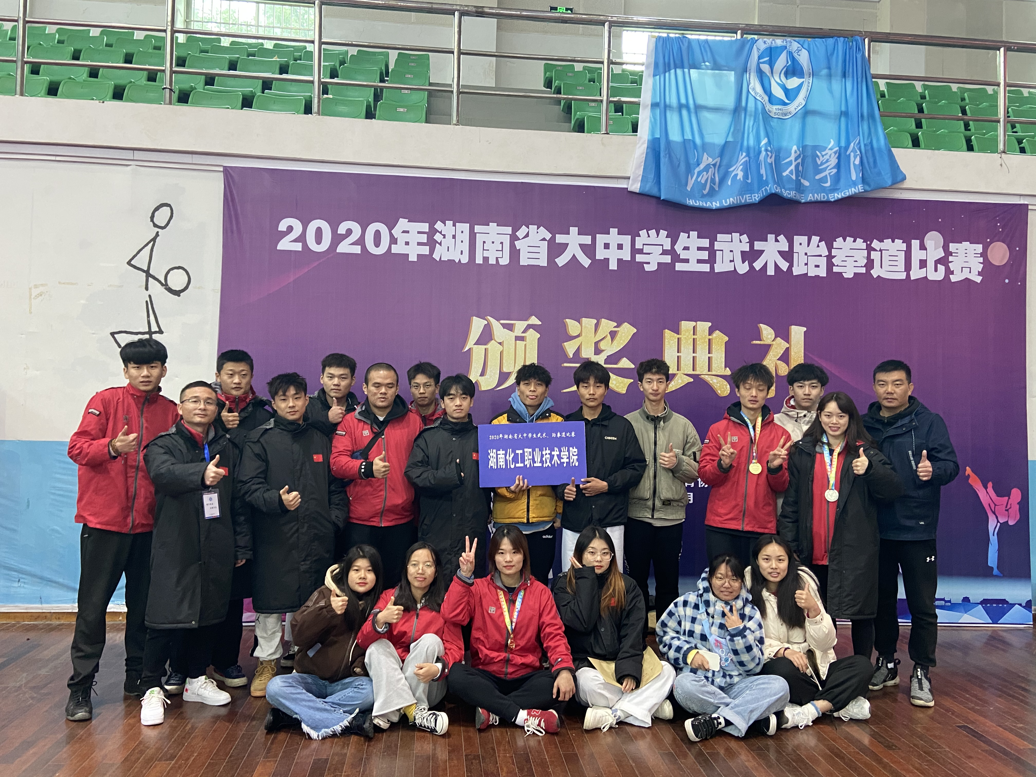 11月20-26日,由湖南省教育厅、湖南省体育局主办,湖南科技学院承办的的2020年湖南省大中学生武术、跆拳道比赛在湖南科技学院举行,本次跆拳道比赛分为大学组、高职组、高中组三个组别,在童双、钟欣两位教练的带领下,荣获四金一银两铜并获高职组团体总分第三名的佳绩。