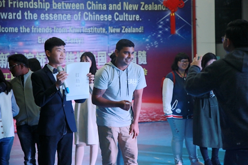 当喜庆的音乐响起,闪耀的灯光下,中国传统的舞狮——《雄狮戏珠》拉开了交流会帷幕,只见那狮子,狮须粗巍,狮目睁圆,狮嘴大开,狮身赤红。一阵接一阵翻滚,忽而跃起,忽而跃下,轻松自如。手拿戏珠的女孩,动作柔美,或转身或挪步,尽展舞狮风采。紧接着是跆拳道协会表演的《道魂》,横踢、侧踢、腾空踢,跆拳道十二式表演将百折不饶精神表达得淋漓尽致。一招一式,一脚一拳,非一日之功。中新交流会上与新西兰朋友们互动游戏当然是必不可少?!澳憷幢然?,我来猜”的接力竞猜游戏中笑声连连,喜乐多多。随后cos play以一袭古风汉服归来,同样用个性飞扬,活泼动感的舞曲吸引了大家,展示中华文化精髓——汉服的魅力?!段脑细栊小返氖榉ū硌荩轿槐硌菡咴谔ㄉ嫌妹市醋?,伴着一首古风之韵,浓浓的复古之风袭来,“崇德尚善,天道酬勤”,寓意深长。 当流行的劲曲响起,立即带动了现场的气氛,激情四射的街舞表演《keep on dancing》,富有极强的节奏感,流畅的舞步伴以重鼓,电音,引发了全场的热情。