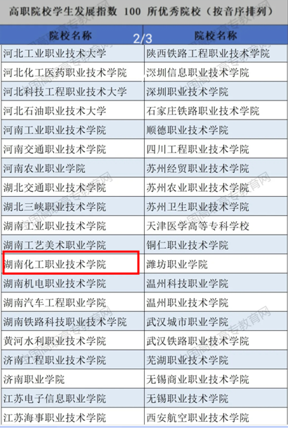 2月14日,全国职业高等院校校长联席会议发布了《关于公布高职院校学生发展指数优秀院校名单的通知》,湖南省有9所高职院入选,我校位列其中,成为高职院校学生发展指数100所优秀院校之一。