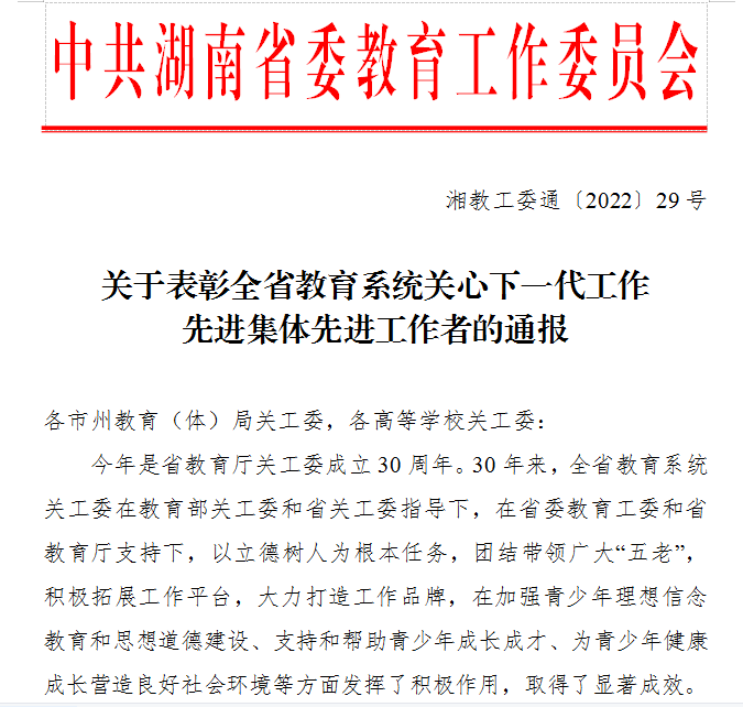近日,根据中共湖南省委教育工委《关于表彰全省教育系统关心下一代工作先进集体先进工作者的通报》(湘教工委通(2022)29号),我校关工委荣获全省教育系统关心下一代工作先进集体荣誉称号。