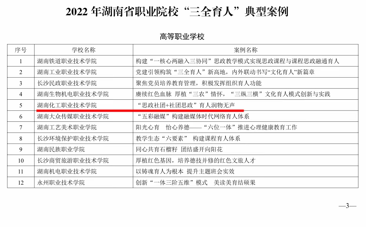 近日,湖南省教育厅公布职业院校“三全育人”典型案例评审结果,我校副校长胡颖蔓申报的题为《“思政社团+社团思政”育人润物无声》案例,经专家评审,被遴选为高等职业院?!叭说湫桶咐?,省教育厅此次共遴选出高等职业院?!叭恕惫ぷ鞯湫桶咐?6个,我校案例的入选,充分展示了学校在学生社团工作方面取得的成效。