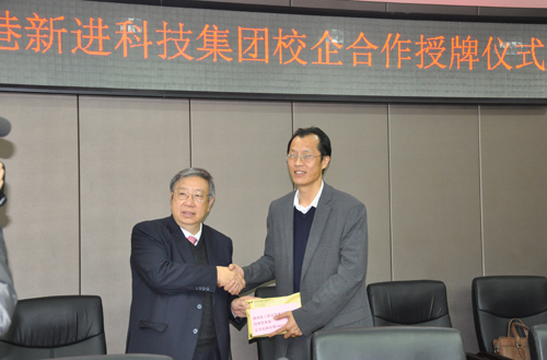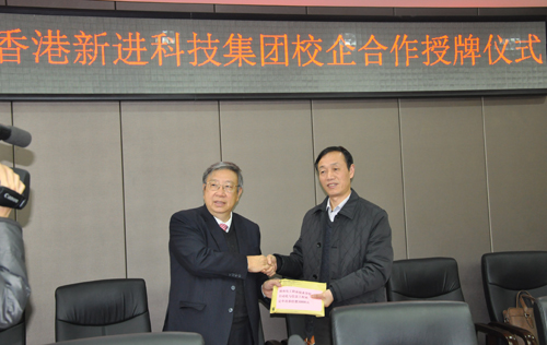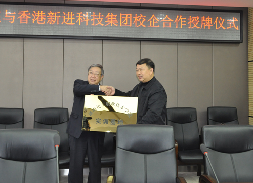 最后,校企双方领导人相互授牌。陈其镳董事长代表香港新进科技集团有限公司向我院经济管理系、自动化与信息工程系分别捐赠校企订单培养经费5万元和3万元。