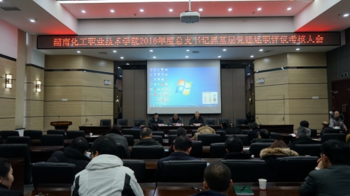 1月10日下午,我校在行政楼一楼会议室召开2018年度党总支(直属党支部)书记抓党建工作述职评议考核会。校党委委员、党群部门主要负责人、“两代表一委员”、 基层党组织书记、基层党组织党员、群众代表参加了现场考核会。会议由校党委副书记刘毅主持。