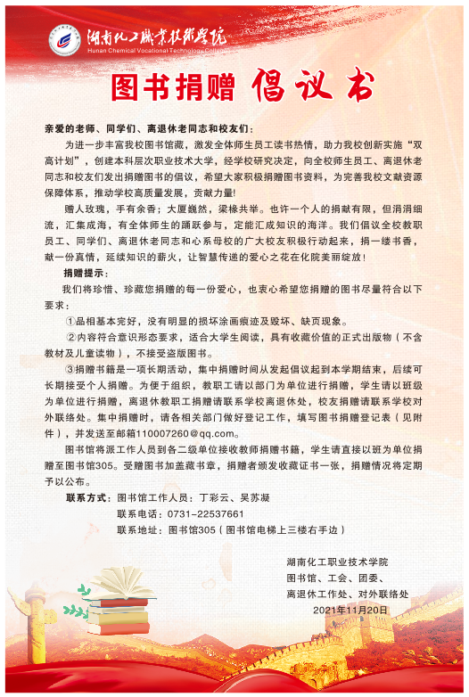 习近平总书记指出:“图书馆是国家文化发展水平的重要标志,是滋养民族心灵、培育文化自信的重要场所。”湖南化工职业技术学院图书馆始建于1958年,2015年迁入职教城新址,占地面积15000平方米。经过60余年的积累,逐步发展成为一座管理科学、业务规范、功能完备、专业特色鲜明的高职院校图书馆。近五年来,图书馆始终坚持以习近平新时代中国特色社会主义思想为指导,全面贯彻党的十九大和十九届历次全会精神,在学校党委行政的领导下,积极发挥校园“第二课堂”作用,以丰富的文化资源培育人,以优雅的馆舍环境吸引人,以创新的服务管理感染人,着力提升大学生的思想政治素质和文化素养,取得了丰硕的育人成果。
