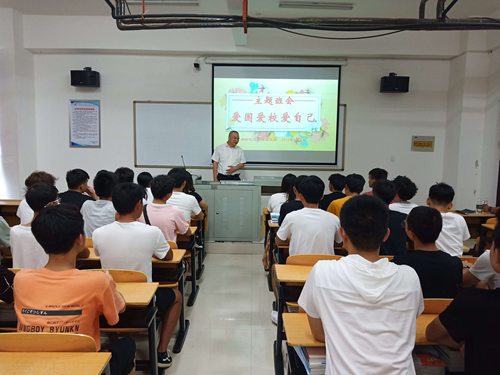 9月8日,开学上课前一天。学校党委班子全体成员携学工系统部分中层干部、思政部教师、辅导员、班主任召开全校性主题班会——《爱国爱校爱自己》,以习近平总书记话语“人生的扣子从一开始就要扣好,从一开始就要树立报国之志”教诲,以生动的案例启迪,以深刻的事实说服,以身边的经历引导,激励青年学生:爱党爱国爱校、自强自立自爱。